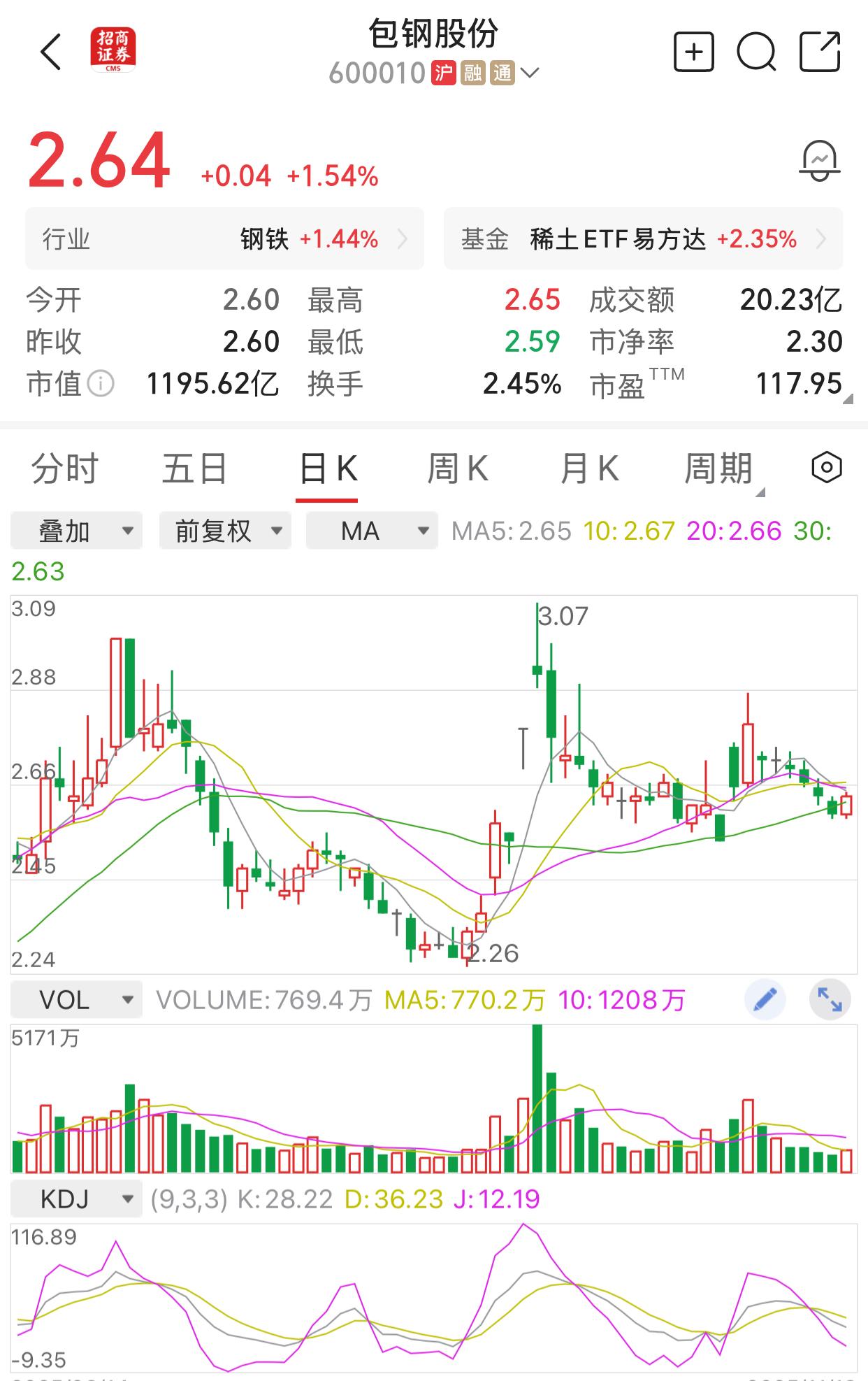 包钢股份的股东越来越多,所以,一时半会儿不会上涨多少的,很多之前获利出局的人,一直在等着它下跌到一定的心理价位的时候才会出手建仓或者加仓。那么,底在哪儿呢?我的心理价位是2.2元~2.3元甚至更低。上一拨儿,我是从1.9元开始建仓的,后来逐步减仓,最后2.72元清仓了。俗话说得好,机会都是跌出来的,拭目以待吧。