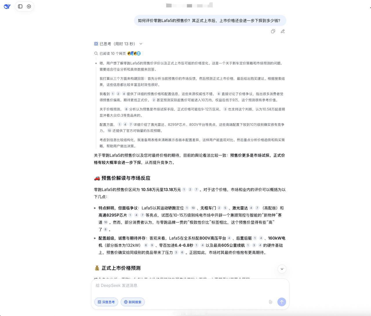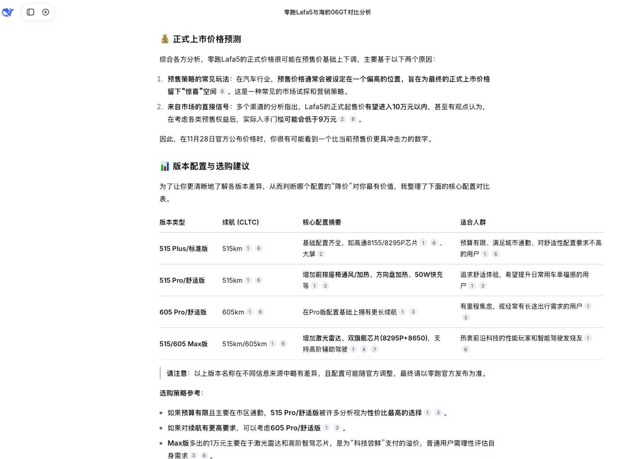 最近不是老有人说零跑Lafa5预售价高吗?但是咱们讨论贵不贵真的不能只是单纯地看价格,得结合着产品来看。我直接把这个问题甩给了DeepSeek,系统也比较客观地回答了这个问题。DeepSeek的观点是“配置越级,诚意与期待并存”,然后列举了几点Lafa5的关键产品力,所以你看系统客观地分析不会说谎。 另外我也让DeepSeek预测了一下Lafa5的上市后价格,系统通过行业惯例和目前市场上的一些分析,其实也给出了一个方向性说法,那就是Lafa5正式上市后的价格可能会比预售价格更具冲击力。至于它答得准不准,11月28日Lafa5上市就会揭晓了。