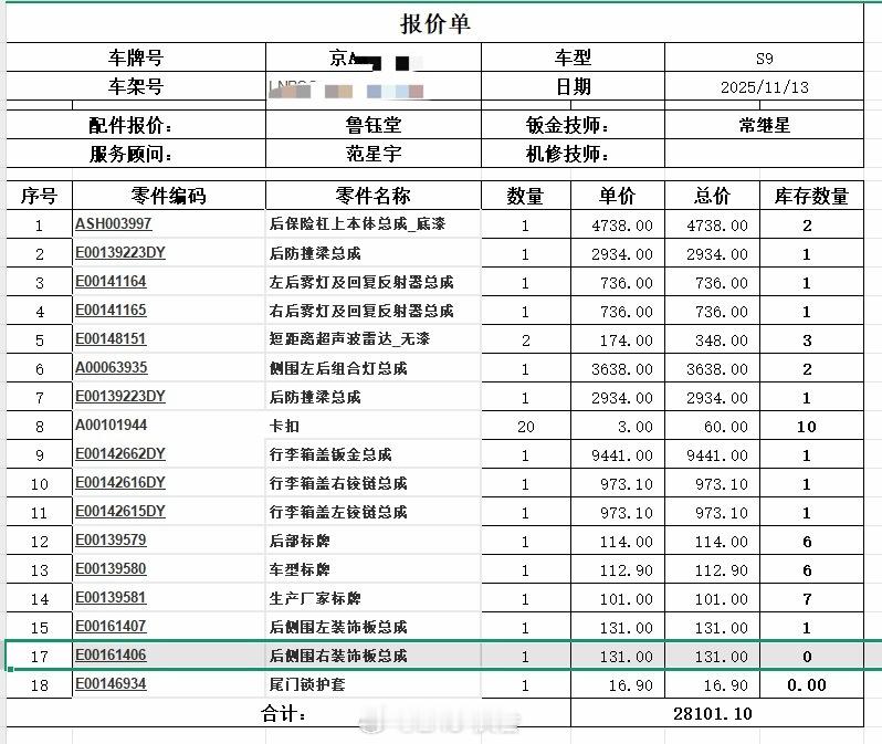 昨天这条内容有朋友在评论区质疑这么小的剐蹭,应该第一时间挪车。 今天定损出来了,果不其然,后防撞梁要换,后备箱盖要换,总金额28101.1,这里面还没有含车衣,加上肯定过3万了