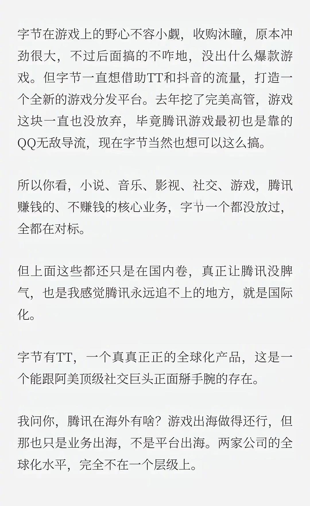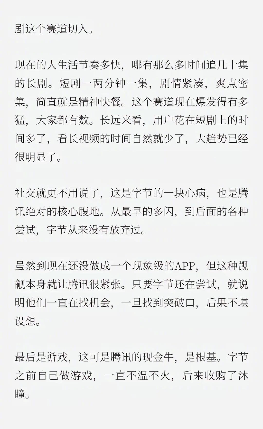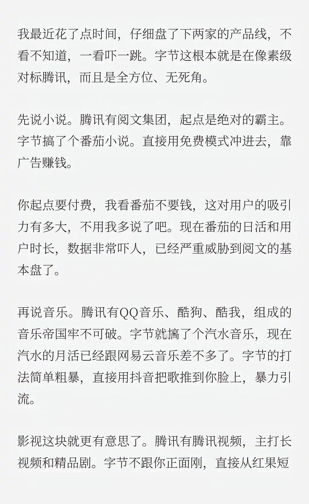 鹅厂最强大的敌人,确实是宇宙厂,各个产品线现在全面对标。刚好看到几段简单的文字,总结得很好。(文字来自网络,侵删)