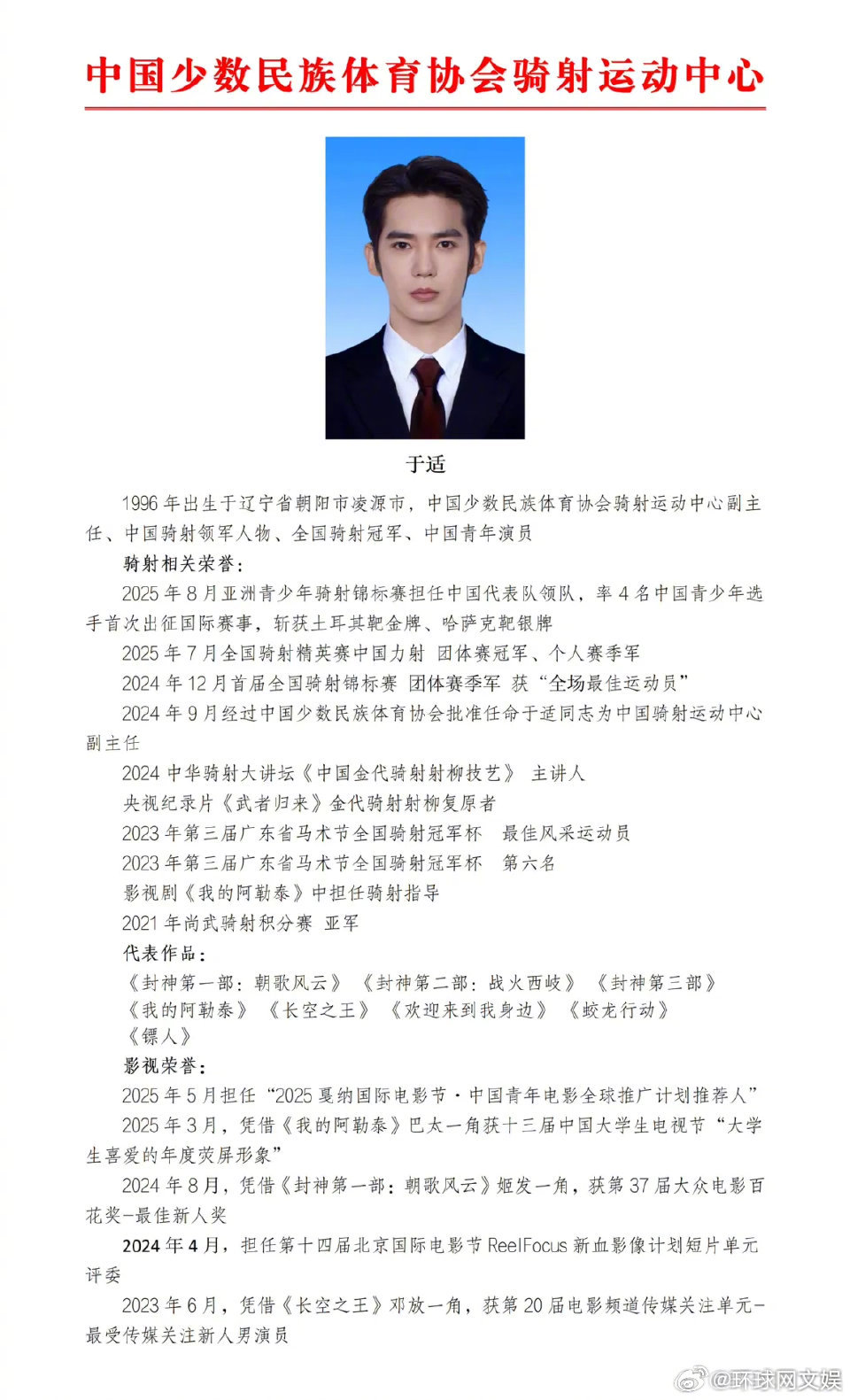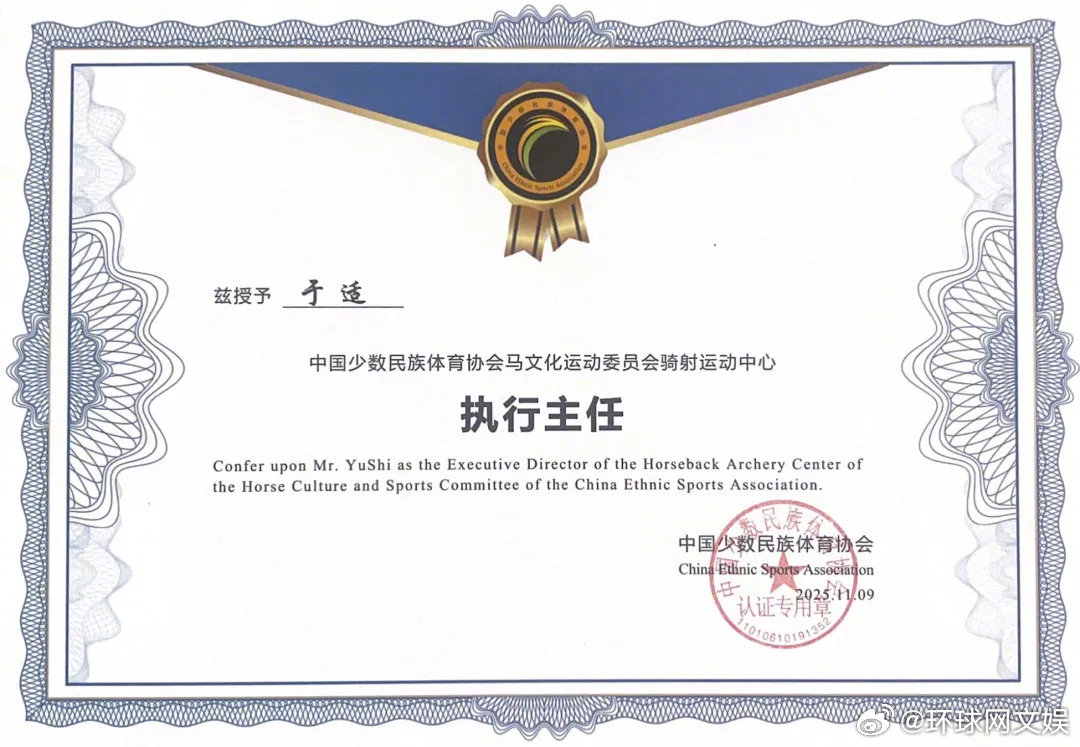 【 】据中国少数民族体育协会马文化运动委员会及下属骑射运动中心公开信息,中国少数民族体育协会马文化运动委员会今日正式宣布,经综合考察决定,任命全国骑射冠军、中国青年演员 为骑射运动中心执行主任。公告称,本次任命旨在充分发挥于适在骑射运动领域的专业能力与社会影响力,强化骑射运动在青少年群体中的传播与推广,促进中华优秀传统体育文化的创新发展与国际交流。