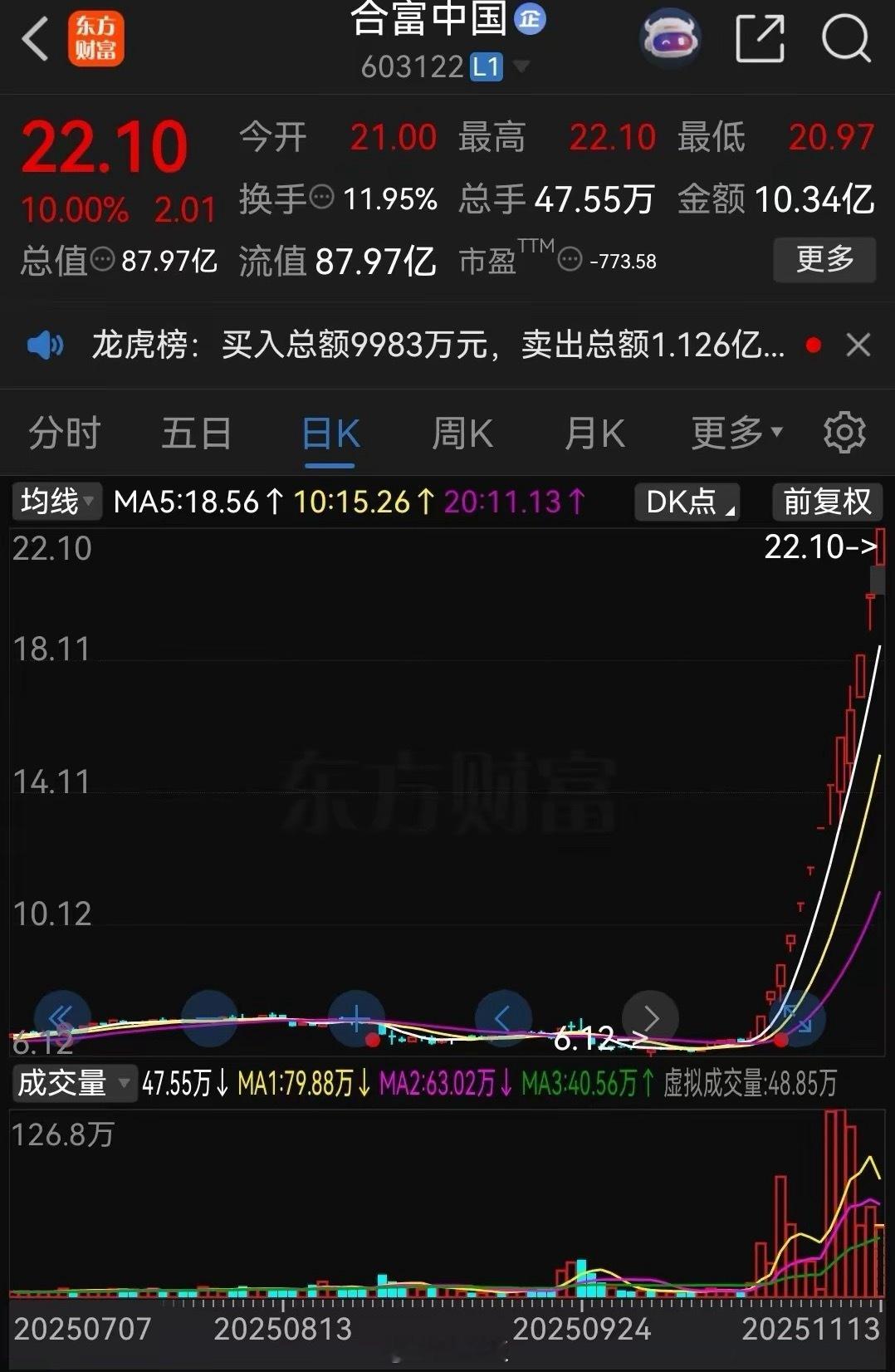 今年的跨年妖股已经浮出水面了!不是平潭发展,也不是海马汽车,目前来看大概率就是合富中国了!公司股价从10月28日开始起涨,13天12板,股价从6块多钱涨到了今天的最高22.10元,半个月时间大涨了3倍多。它有三个条件满足“妖股”的特征:一是价格低,低于10元,特别是这种五六块钱的股票,尤其受主力喜爱,拉升空间大。二是市值小,没启动前只有20多亿的流通市值,现在涨了三倍多也才80多亿的市值。三是超跌加亏损,拉长看k线盘整了好几年,股价处于历史低位,没启动前股价几乎走成了一条直线,快成僵尸股了,再加上业绩亏损,散户一般不敢碰,筹码非常干净,所以才能疯狂拉升。这个已经错过了,对照这个标准,可以寻找下一只跨年妖股!