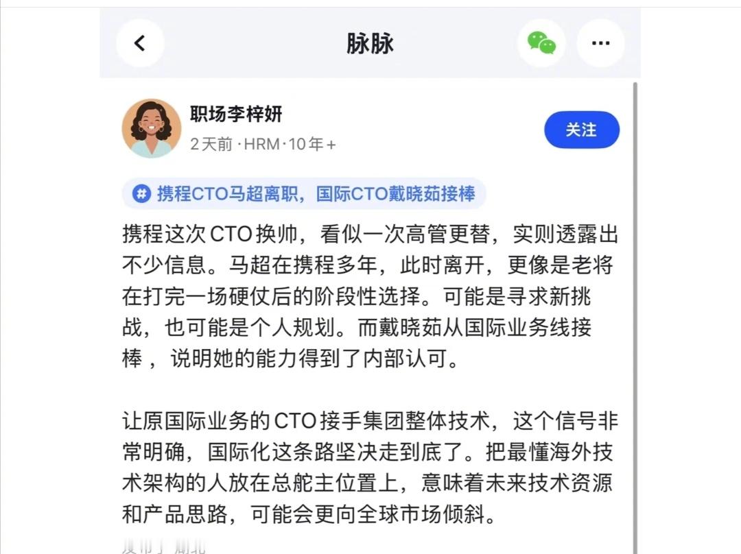 事先没有任何预兆,携程换CTO的举动,不知道前期走的方向以及系统架构会不会受影响