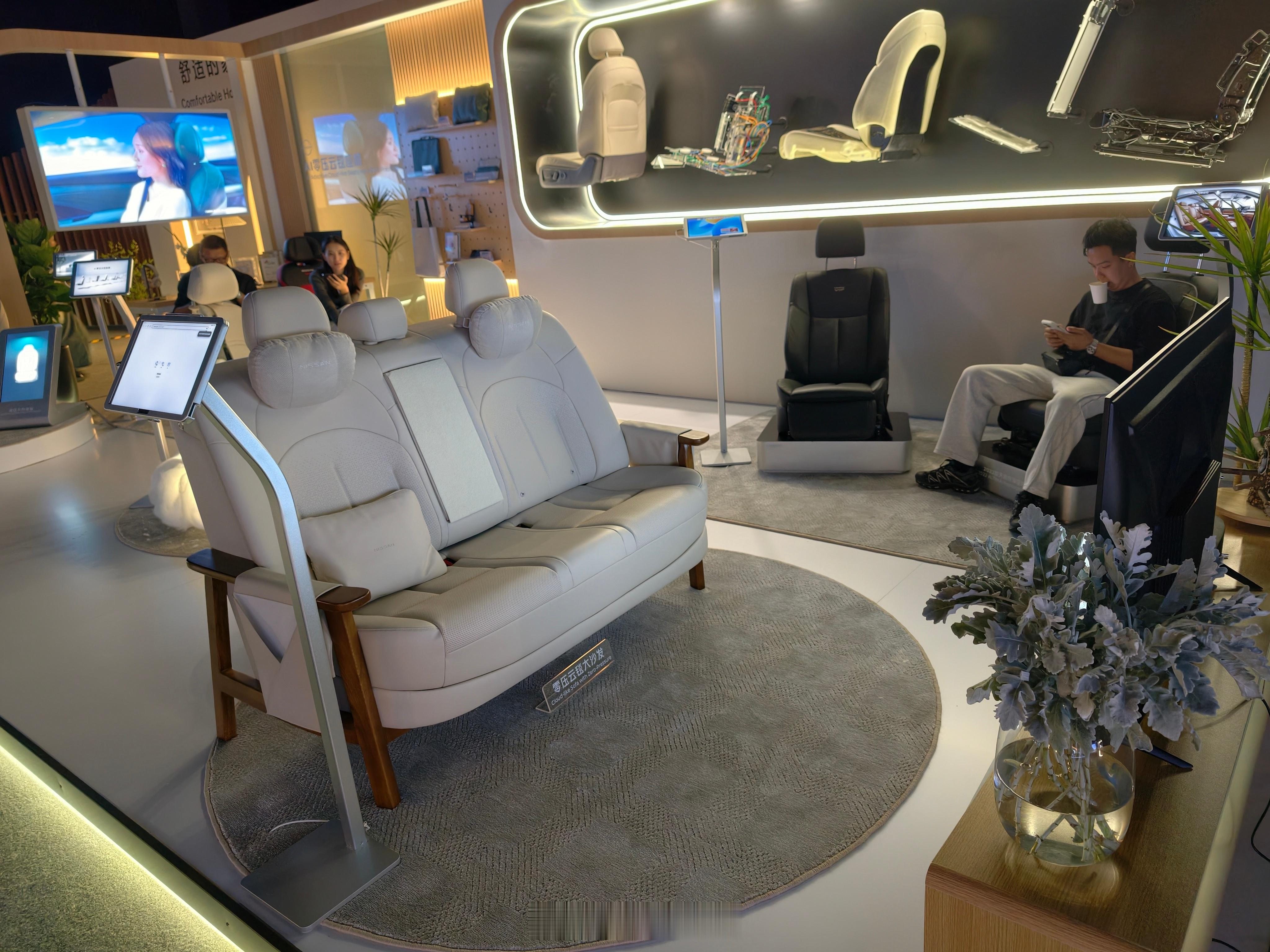 日产真的太能整活了N6发布会现场布置了一个客厅的温馨场景,坐在沙发上看个电视,但这沙发我越看越不对劲,这不就是汽车二排吗日产给做成了家用沙发,这个我太喜欢了沙发厂实锤