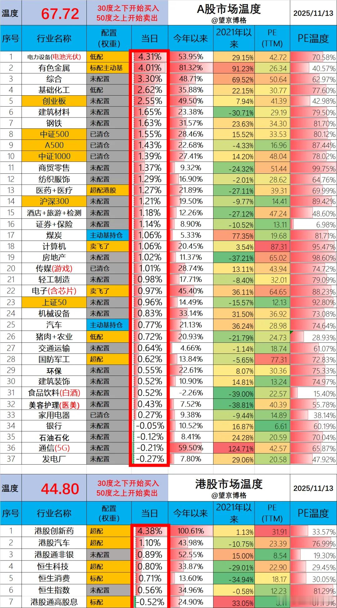 今天净值出来了。场内ETF账户今天盈利2.5万(资产240万);场外基金账户今天盈利7.3万(资产560万);两个账户合计盈利9.8万,周一盈利6.7万,周二亏损2.0万,周三盈利3.0万,周四盈利9.8万本周累计盈利17.5万。晒个实盘,主要盈利来源港股创新药与易方达资源。今天内容都写在:化工涨得比创新药还多?我持仓的ETF哪些赚得多?2025年11月12日 市场温度A股温度67.72度;港股温度44.80度;统计数据不易,大家点赞支持。