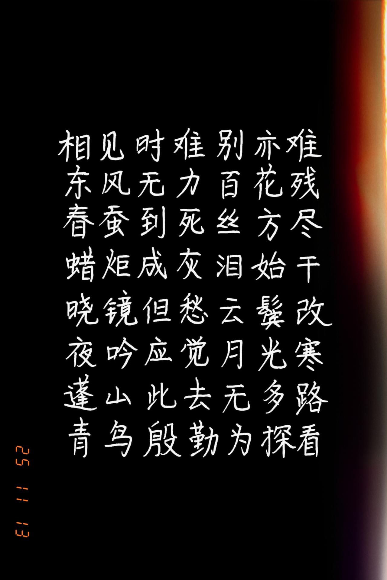挑战专注写字打卡|正楷第8天 “相见时难别亦难,东风无力百花残”。 李商隐在外做官,妻子在遥远的老家悉心照顾母亲和孩子,回家一次很难。 这又何尝不是我们现在这样的处境呢,想守着的感情却被迫异乡漂泊谋生。 “春蚕到死丝方尽,蜡炬成灰泪始干”。 结婚多年,我们的爱情早已经升华为亲情,但我们从未放弃对爱情的执着,对理想的追求,对命运的抵抗… “晓镜但愁云鬓改,夜吟应觉月光寒”。 你大概也是夜不能寐,辗转千回吧,越发感觉环境凄苦,月光寒冷。这夹杂着无尽思念的痛苦,牵挂着对方感情的执着。 “蓬山此去无多路,青鸟殷勤为探看”。 距离毕业多年了,才真正的理解李商隐身陷囵圄,抱负无法施展,内心极度痛苦,为情所困的伤感缠绵与执着 楷书打卡