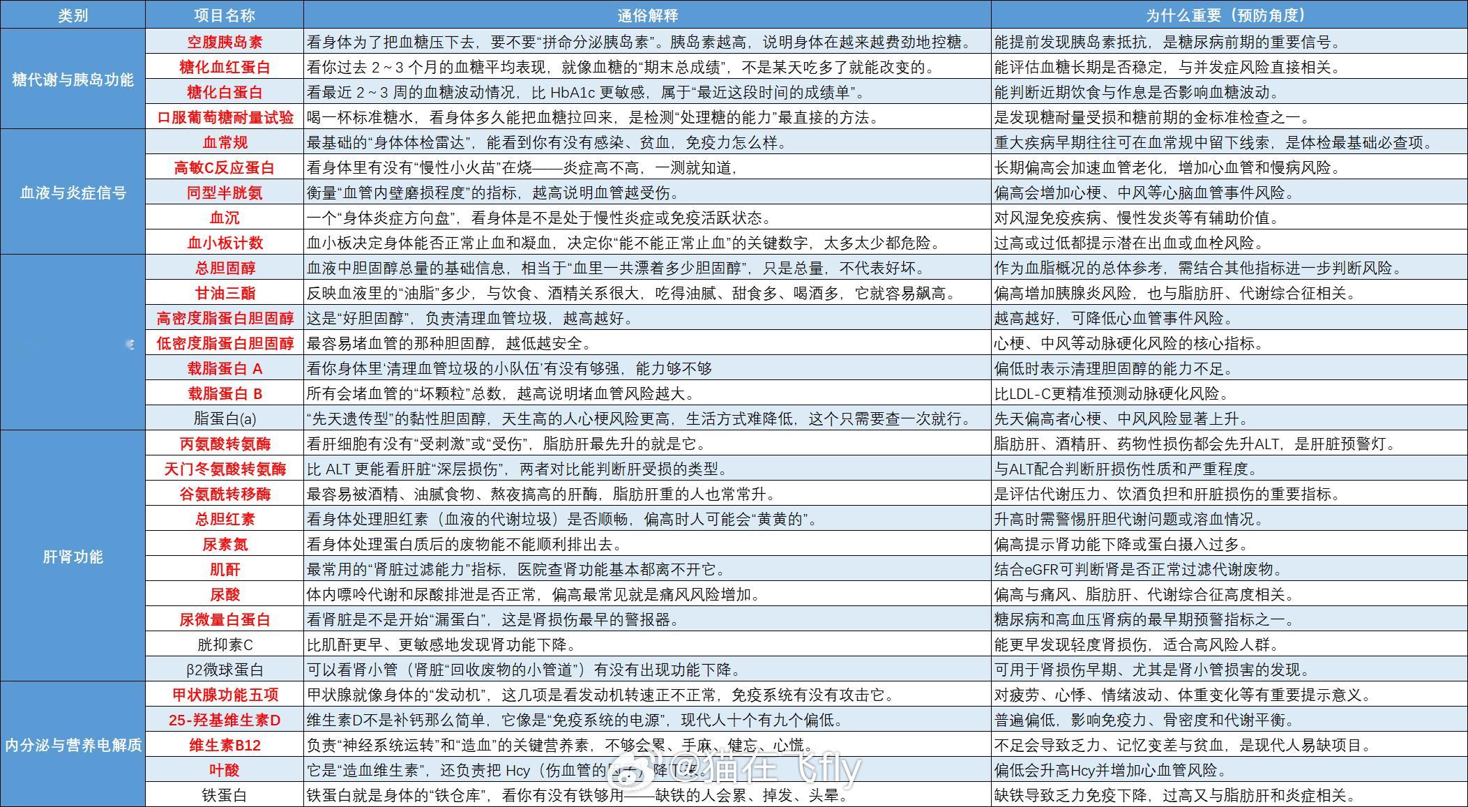 本来想着先写益生菌、鱼油之类的,当时想着这些我自己有亲身经历可以写的更详细一些,后来想想不如更系统从开头讲,把我自己之前想但一直没有做的事花了些时间给做了。 所以这个贴呢,就是【先了解自己的身体,再进行有针对性的预防养生措施】,就是找个自己最近的体检数据或者检查数据,咱得知道自己的情况嘛,再进行自己比较在意的或者问题项,进行有针对性的养生调理,会更好一些。 猫把可能出现风险的方向,分成了五个大项目,这些项目呢,从预防医学的角度思考的(就是提早发现),绝大多数都是每年体检的时候会检查到的,图1是猫自己做的跟踪数据(大家可以自己做表格用来跟踪数据),这东西跟踪起来长期看,是能看到变化的,很有意思。 因为猫也不是专业的,下面这些思路和内容,是猫对群里的大佬, 面面老师的分享并结合GPT5的临床医学、预防医学背景的专家进行了整理,来给大家做分享。--------------------- 图2是详细的检查项目,大家可以收藏,用了通俗解释和为什么重要这两项进行了罗列总结。 接下来呢,猫会把这5项按照年龄关注度,高风险人群、为什么要查以及重点补剂 / 干预这些项目进行了罗列,可以直接对着自己的情况看。 内容也比较多,稍后我整理好了,按5个帖子发,最后会整理到这个帖子上,今天就先这样,老师们别催哈。。