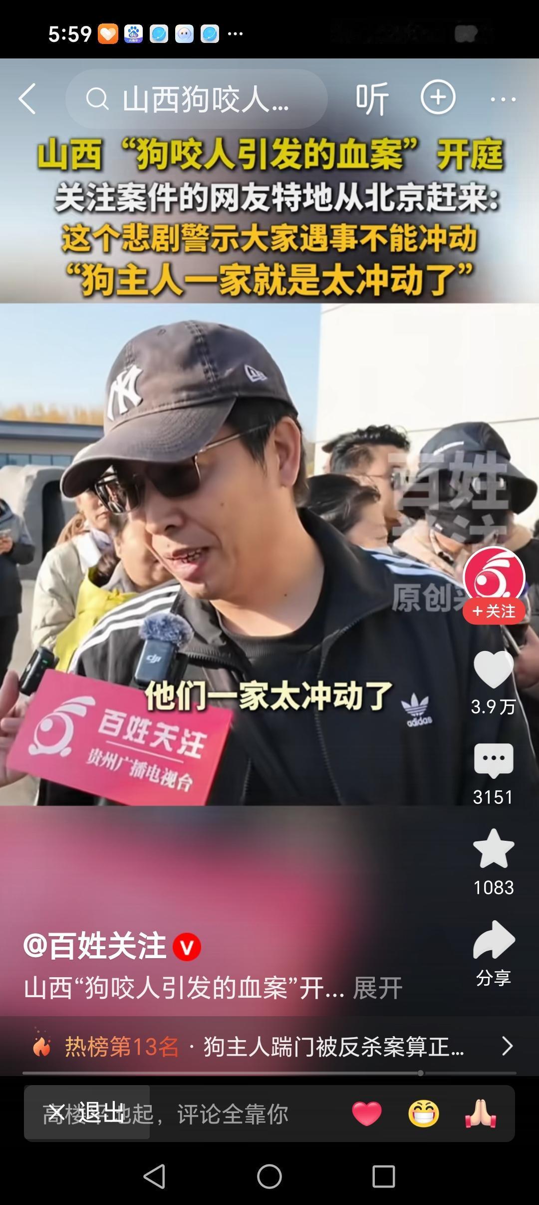 山西“狗咬人后被邻居摔死,狗主人上门理论遭反杀”案将开庭,网友们热议,到底这邻居是正当防卫还是故意为之? 现在,大家争议的就是这个焦点。 这个事情的起因发生在2025年的1月30日。 事情很简单,邻居小申在出门打水时,被拴在路边树上的一只小狗咬伤了。 这个狗不大,是中华田园犬,只有20斤左右。 小申被突然从路边窜出来的狗咬了两口。 他很生气,气的他抓起栓狗的链子使劲摔了下去。 不幸发生了,狗狗居然死了。 小申回家后,把这个事情和妈妈说了。 小申妈妈觉得应该和狗的主人说一说 这个事情。 所以小申的妈妈联系了狗主人郭某的姐姐。 狗已经死了,看看赔能够偿多少钱? 可是他们家拒绝了。 他们会还咄咄逼人问:"为什么要从狗跟前路过"? 小申妈妈想赔偿狗狗主人,可是却碰了一鼻子灰。 没想到,他们一家人憋着大招呢。 当天晚上7点多,狗的主人郭某就带着他的亲朋好友九个人,到了小沈的家门口,为他的小狗,讨个说法啊。 他们砸了小申家的玻璃,把大门踹开,破门而入。 晚上吃饭的时候,小申家人都在家。 小申的爸爸妈妈,姐姐,都在家。 他们一言不合就上手。 他们拿着铁锹,棍子闯入小申家 小申姐姐吓坏了 没有见过这么多人。 狗狗主人说,你们家的人没有我的狗值钱,打狗还要看主人呢。 谁也不知道这个中华田园犬到底值多少钱? 谁也不知道咋回事? 两家人就动手了。 小申家4口人,对狗狗主人家亲朋好友9口人。 这人少的肯定吃亏。 在混乱中,小申父亲从屋里拿出了一个用于杀鱼的刀胡砍乱砍。 他砍伤了三个人,狗狗家的女主人,女儿,妹夫都被他砍伤了。 而狗狗主人受伤严重,抢救无效死亡。 小申父亲也是全身有伤,鼻骨骨折。 这就是全过程。 我们盘点一下事情发生的真相。 第一,他们家狗拴到大街上这是事实。 第二,受害人小申被狗咬了这是事实。 第三,狗确实被小申打死了,这是事实 第四,受害者报警了这是事实。 第五,狗狗主人未接受警方调解是事实 第六,行凶者带9人闯入民宅是事实 第七,行凶者砸门、破窗、持械群殴是事实。 第八,受害者被逼无奈,家中正当防卫是事实。 两家是邻居,因为这么一条狗,反目成仇,不值得。 他们这是两败俱伤,没有赢家。 原本都是一个村的邻居,虽然两家相处的一般,但是见面都会问好的那一种邻居。 平常他们两家没有一丝矛盾。 却因为一条狗,弄的两家都受到伤害。 我们期待公平公正性的结果。