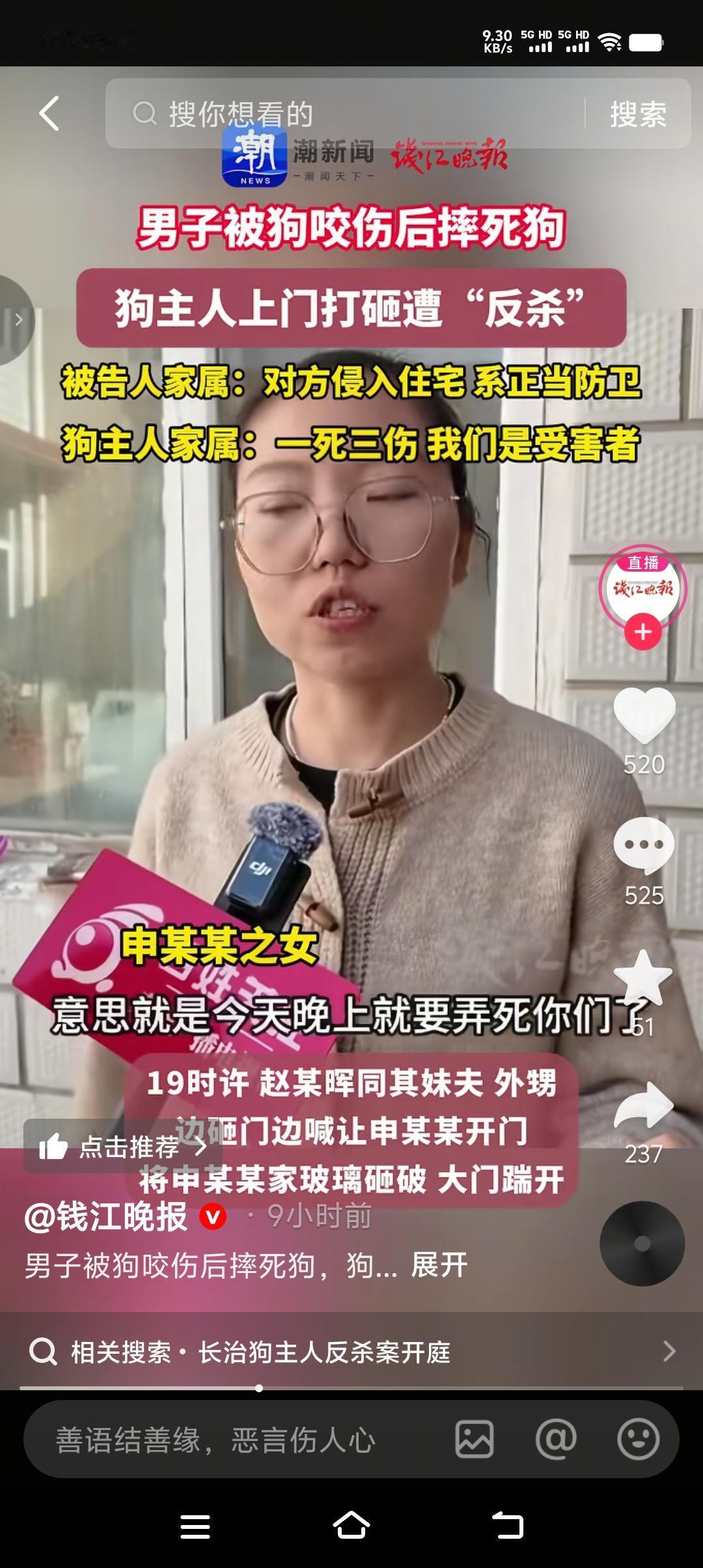 “我哥进去就砸了一下玻璃,也没有说打人干嘛”,说的多么轻描淡写,说的多么小众。要知道这样的行为放在美丽国,就不是一个人躺下那么简单了。 据说这家女主人身份比较特殊,这也难怪为什么如此嚣张跋扈。只可惜这次踢到钢板上了,狗被反杀,狗主人也被反杀。 死者身中八刀,只有大腿上这刀是致命伤,到底是正当防卫还是防卫过当,还是过失杀人?我们都是局外人,不能贸易下结论。只想说的是对于任何非法侵入住宅者,法律必须给予严厉打击。