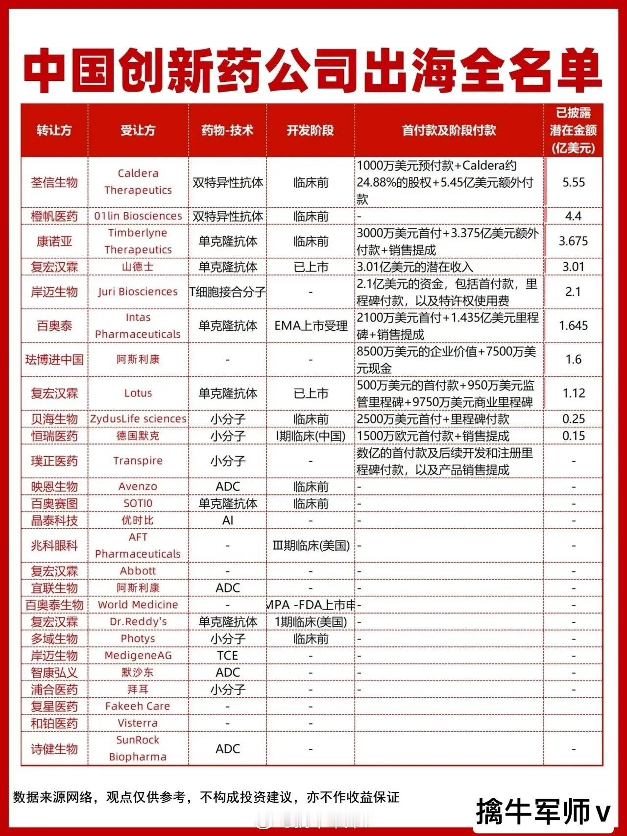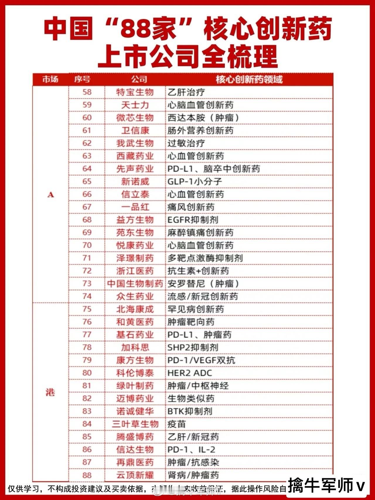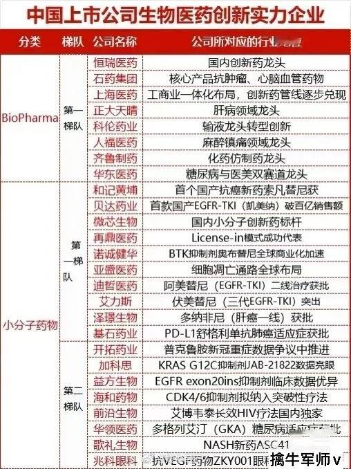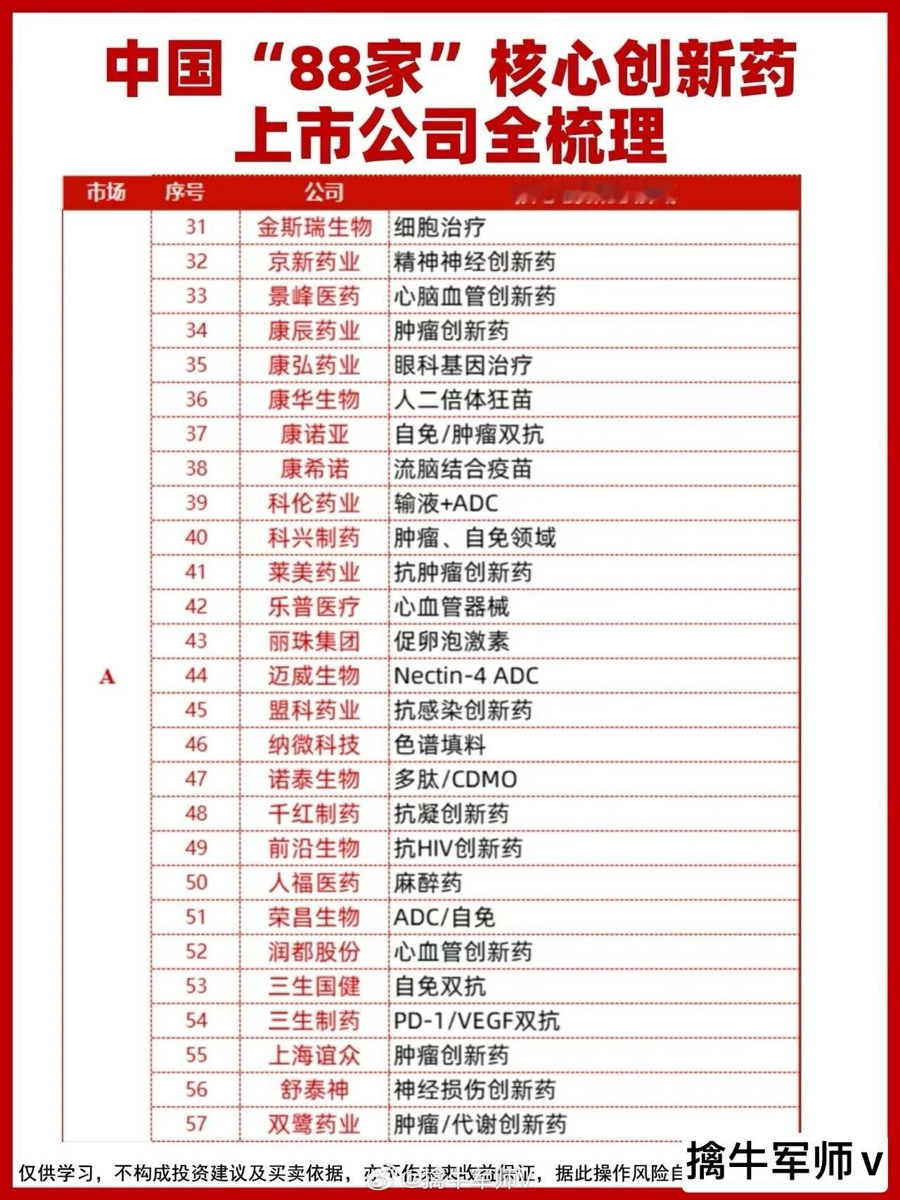 中国创新药核心龙头88强名单出炉!创新药是具有全新化学结构、新靶点或新治疗机制的药物,中国88家核心创新药上市公司全梳理!从细胞治疗、肿瘤新药到疫苗、ADC等前沿领域,既有A股药企深耕细分领域,也有港股公司布局全球创新。都是行业细分领域龙头代表值得关注!中国生物医药创新实力企业梯队划分!第一梯队:恒瑞医药、百济神州等,覆盖肿瘤、自免、ADC等热门赛道;第二梯队:前沿生物、乐普生物等等也在细分领域冲刺突破。(具体龙头名单见配图,资料取材网络仅供参考)这些企业从靶点创新到商业化布局,撑起了中国创新药的“硬实力”版图。理财有风险投资需谨慎!