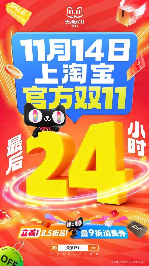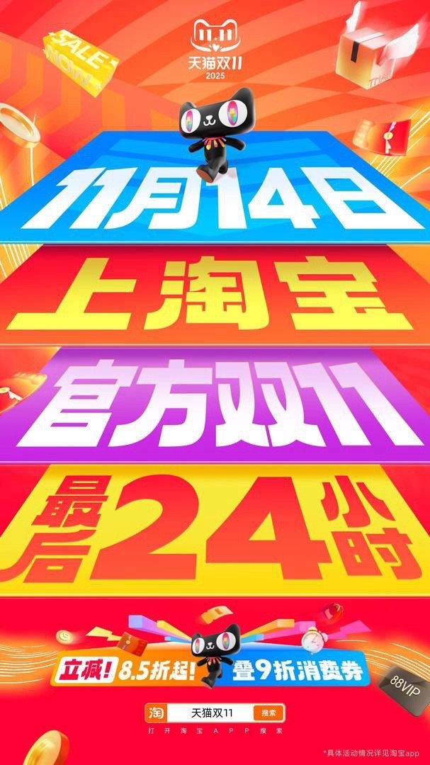 闺蜜疯狂喊我拼单,说天猫双 11 只剩最后一天!上淘宝官方立减 8.5 折起叠 9 折消费券,早 10 晚 8 搜【购物金】限时膨胀,万券叠加 5 折起薅美妆、服饰~ 全年真优惠就这波,快喊搭子一起清购物车,错过真的亏麻了!