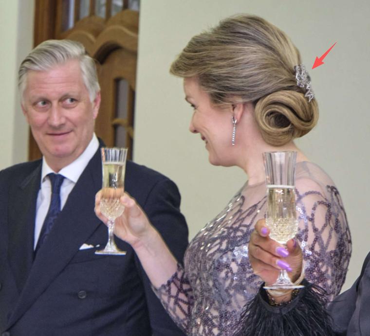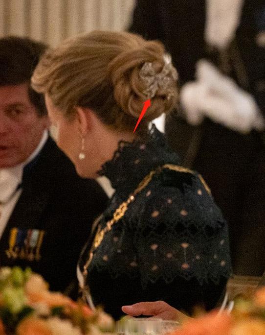 比利时王后玛蒂尔德的蝴蝶结胸针,2019年佳士得拍品,当时拍卖行描述为某不具名贵族小姐的收藏,制作于1910年代,估价8000-12000瑞郎,18750成交(十来万rmb) 玛蒂尔德最早在2022年英女王伊丽莎白二世葬礼相关活动戴过,后续也见于两场级别相对较低的国宴(即不佩戴王冠),她选择用这枚蝴蝶结胸针装点发髻 众所周知,比利时王室因为各种原因珠宝在圈内相对较少,玛蒂尔德能用打眼的胸针更不多,这胸针就显得十分有性价比了