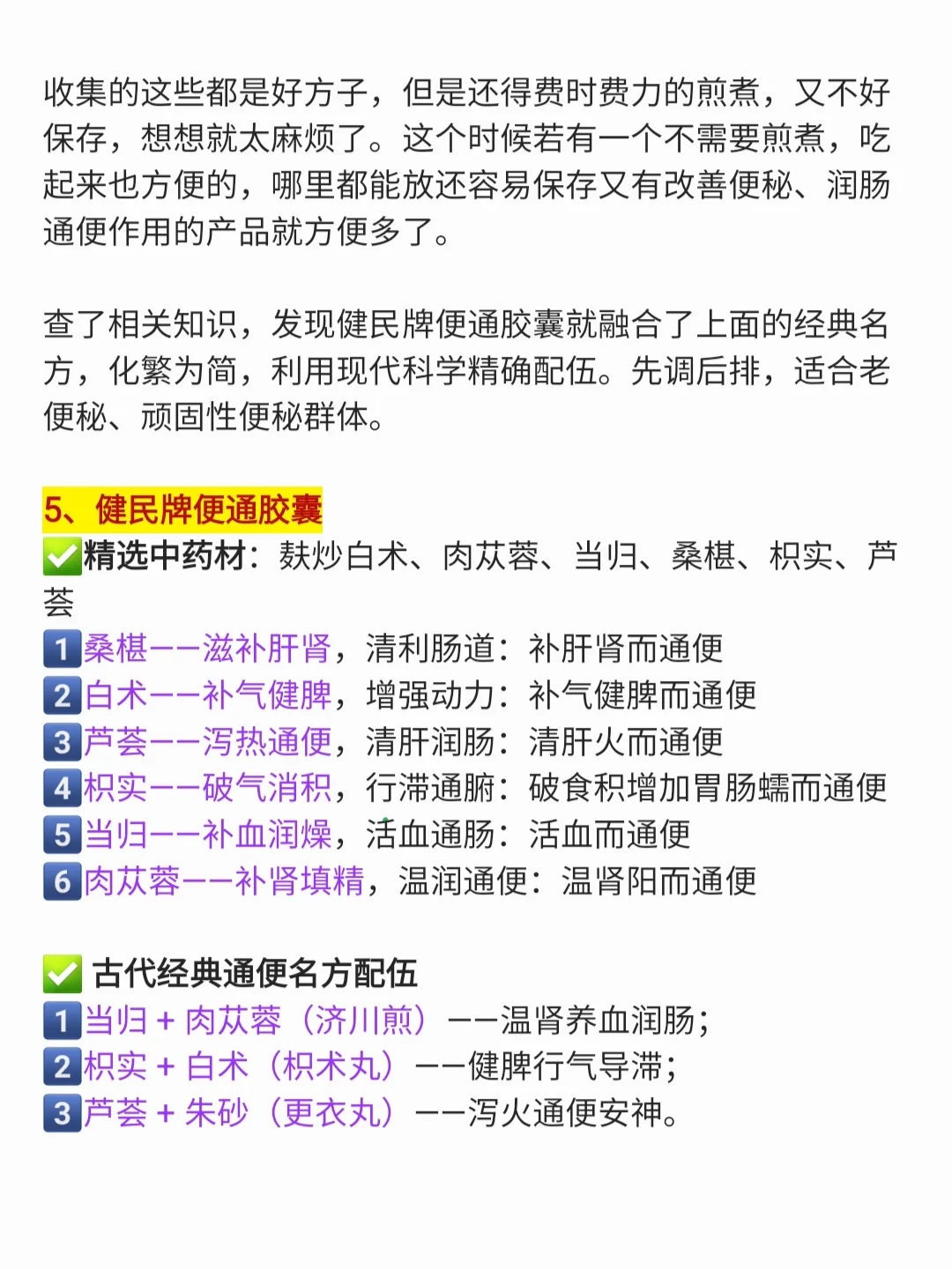 查了相关知识,发现健民牌便通胶囊就融合了上面的方,化繁为简,利用现代科学精确配伍。先调后排,适合老便秘、顽固性便秘。