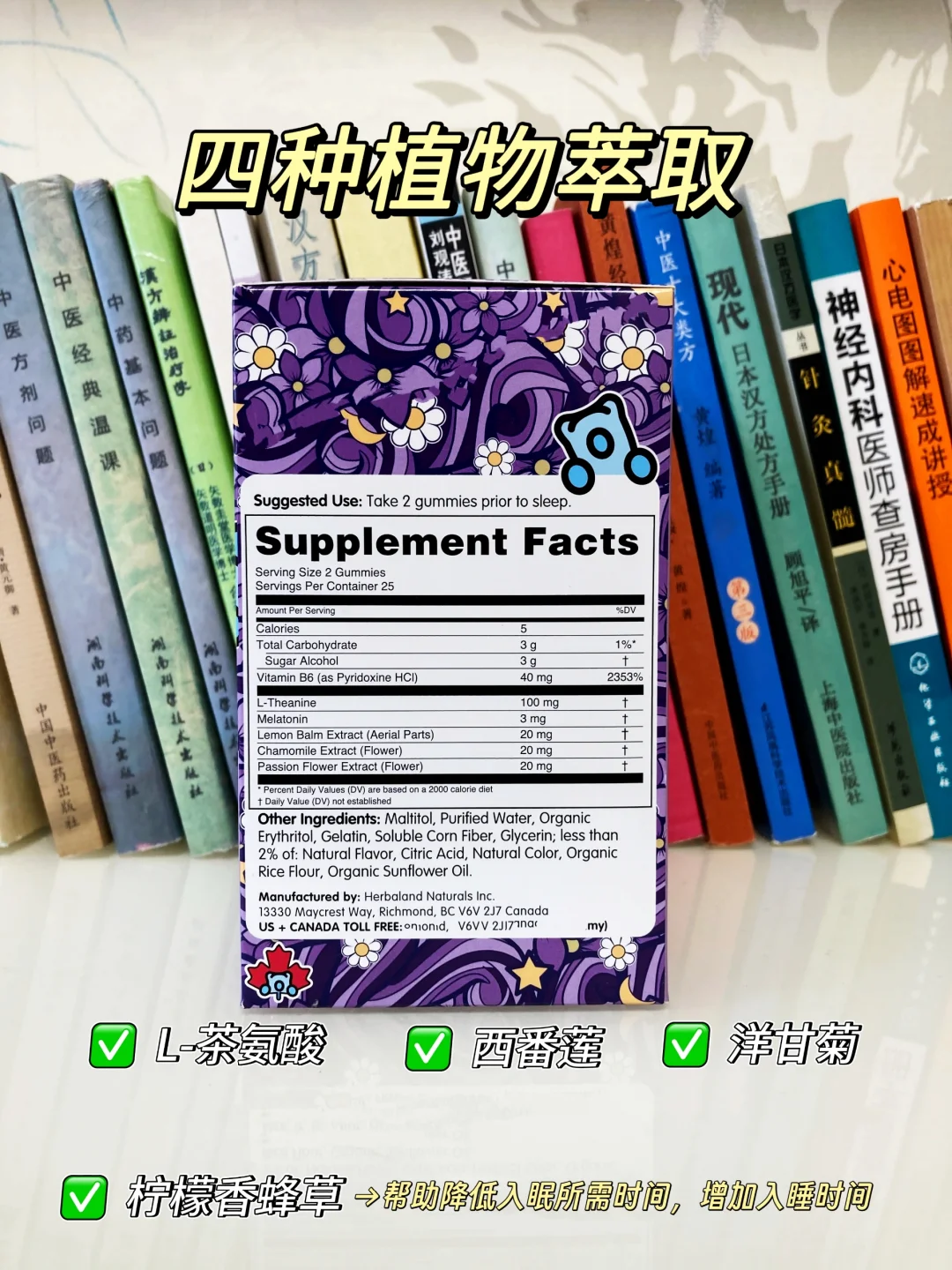 另外,四种植物成分:L-茶氨酸、柠檬香蜂草、西番莲和洋甘菊,像柠檬香蜂草能帮助降低入眠所需时间,增加入睡时间🌿💐