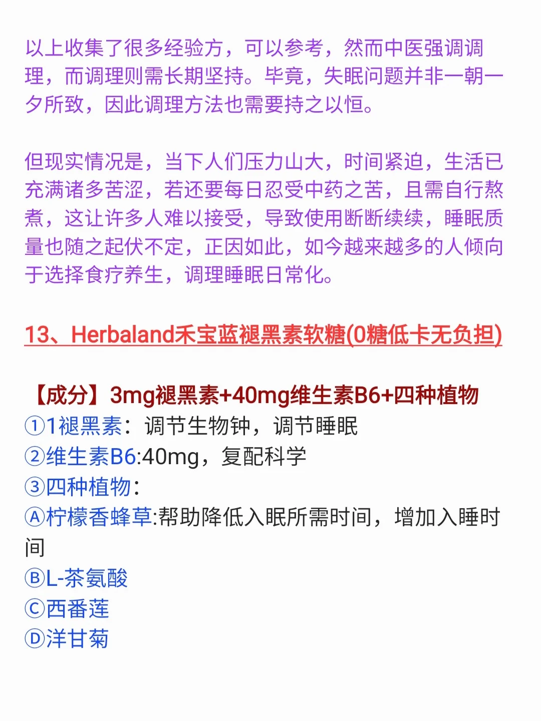 🌵作为一个常年熬夜的打工人,入睡困难简直是家常便饭。尝试过各种方法,效果都一般,以上收集的中药方,也都试过,效是有效,苦是真苦,一想到每天还要喝苦苦的中药,真的坚持不下来。一直再找一个可以坚持住且融入生活的改善睡眠的好办法,看了Herbaland禾宝蓝褪黑素软糖的介绍,自己也稍微研究了一下,觉得还是蛮合适的。