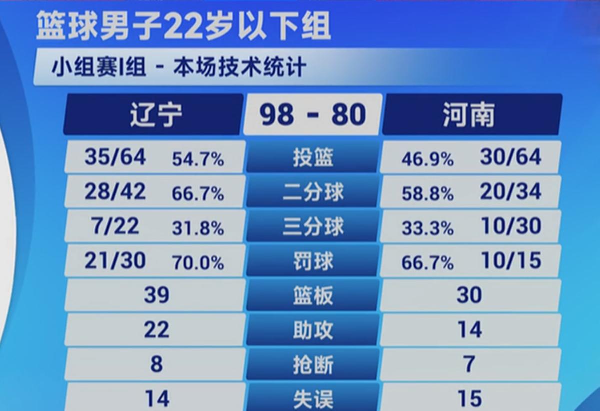 辽宁U22男篮98-80胜河南,够硬 北京时间11月13日,全运会U22男篮比赛日,辽宁男篮98-80胜河南,够硬! 球迷皆知,此前的资格赛打架事件,黄秋实和张峻豪两人禁赛,而另外两位更重要的球员,王俊杰和赵维伦征战NCAA也不打,如此一来,球队竟然仅有9人能够出战,本场比赛更是仅7人为主轮换阵容,结果,他们依然以18分大胜,够硬。 数据方面:刘金雨轰下31分,张陈治锋和孙翔祥各自贡献16分,何佳轩15分。