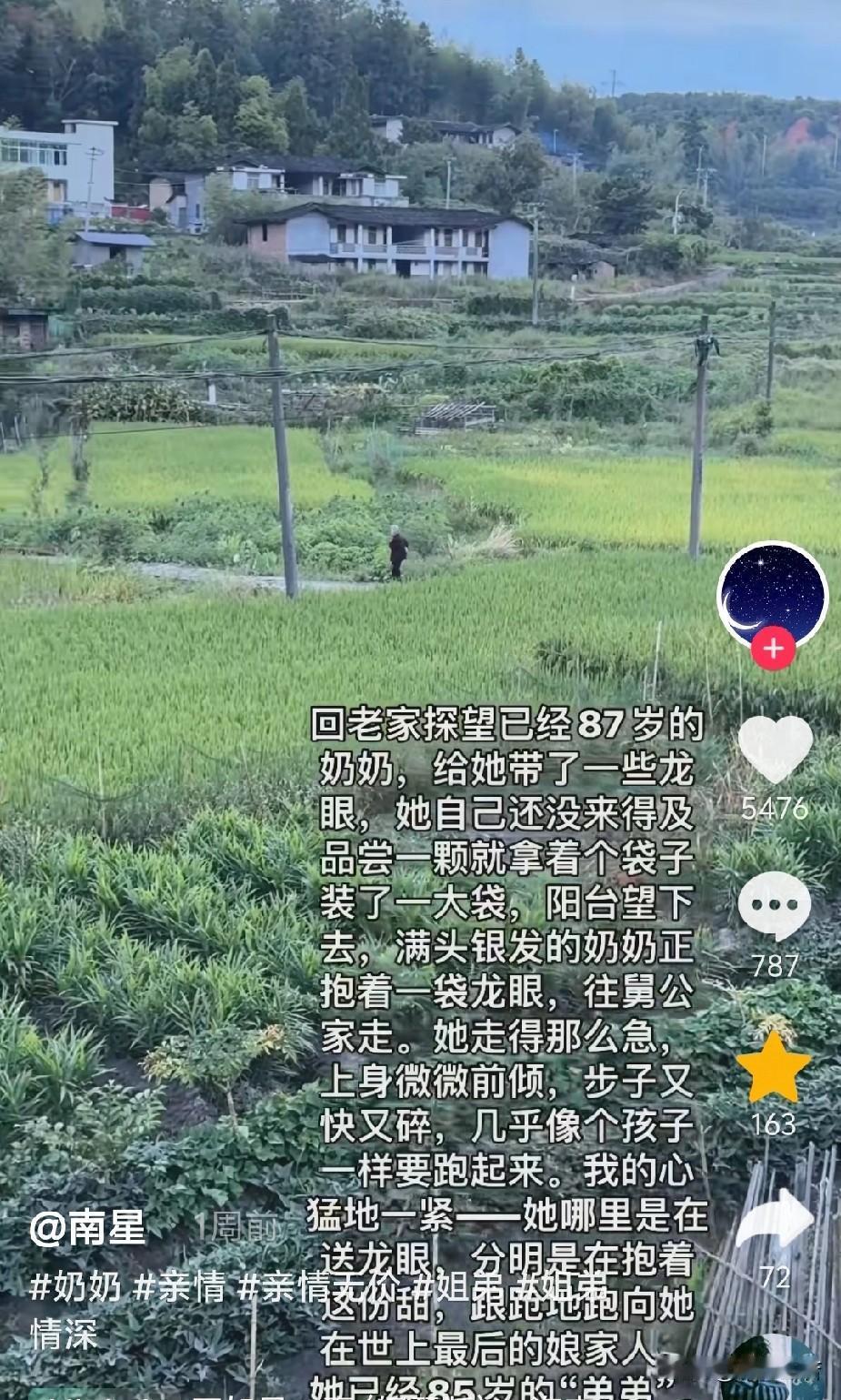 近日,福建,一名女孩回老家看望87岁的奶奶,给她带了一些龙眼。没想到,奶奶自己还没来得及品尝一颗,就拿着袋子装了满满一大袋,随后急匆匆出去了。 女孩有点好奇,站着阳台望下去,满头银发的奶奶正抱着一袋龙眼,往舅公家走。奶奶走得那么急,上身微微前倾,步子又快又碎,几乎像个孩子一样要跑起来。 女孩的心暖暖的,禁不住感叹:奶奶哪里是在送龙眼,分明是在抱着这份甜,踉跄地跑向她在世上最后的娘家人,她已经85岁的弟弟,有姐姐的弟弟真是太幸福了。 看完视频,心里酸酸的又暖暖的!87岁的奶奶,自己还没尝龙眼,就急着往弟弟家送,那前倾的身子、又快又碎的步子,哪里是送水果,分明是把晚辈带来的甜,当成最珍贵的心意,急匆匆分享给世上最后一个至亲的“小弟”呀! 这份惦记太纯粹了,不管多大年纪,在娘家人面前,永远有孩子气的热乎劲儿,这份亲情比龙眼还甜。87岁的奶奶,在85岁的弟弟面前,还是那个会急着分享好东西的小丫头。 在奶奶眼里,不管自己多大年纪,有娘家人在,就还有可以任性分享的人;不管东西贵不贵重,这份“有好东西先想着你”的心意,才是最暖的甜。这份藏在龙眼里的牵挂,比任何补品都更显亲情的珍贵。(来源:南星)