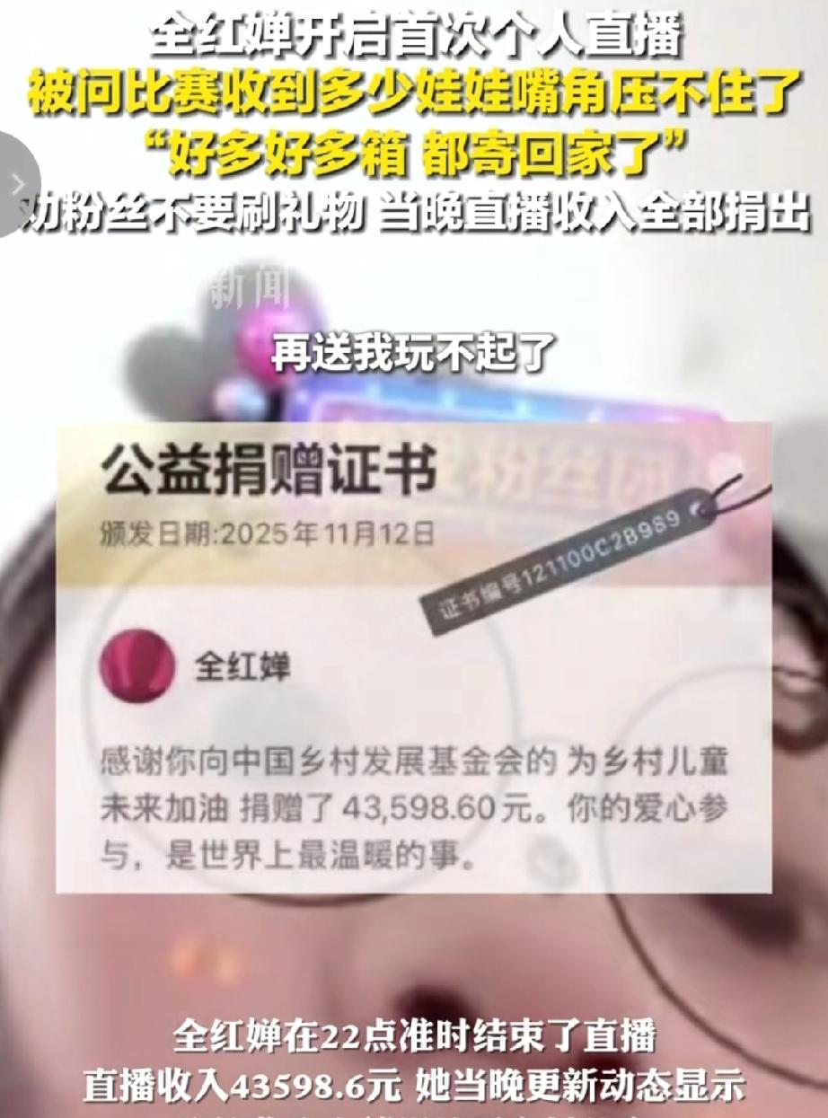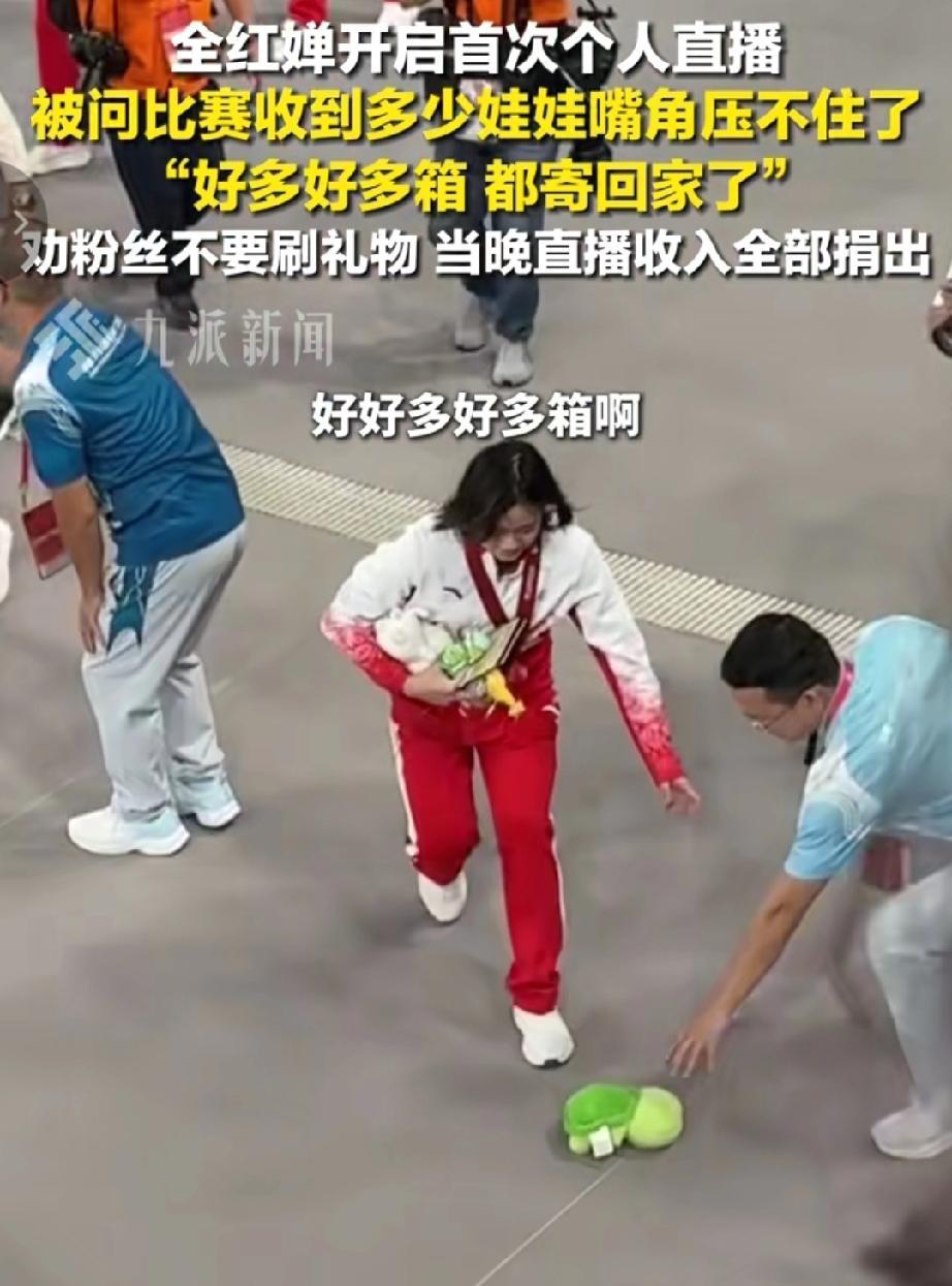 全红婵一场直播,关注到两个信息: 一个是收到好多好多箱娃娃,都寄回家了。 另一个是直播收益4.3万,下播后直接捐给乡村儿童了。 虽然钱并不太多,但对大多普通人来说也是一笔巨款了,但这小姑娘捐得干净利索,一分一毫都没留。 主打一个“钱可以捐,娃娃必须带回家。” 不得不感叹,在这个物欲横流的时代,这小姑娘还保留着一颗干净、纯粹的心。 粉丝们喜欢婵宝,她也对粉丝们送的礼物非常非常珍惜,将这份厚爱安放得很好,真是双向奔赴的美好。 不过,收这么多娃娃,到时候婵宝的新家是不是得专门腾出一间放娃娃呀? #新锐创作者成长计划#