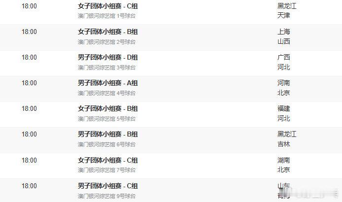 2025全运会乒乓球成年组团体赛今日拉开大幕10:00男子团体小组赛A组 1号台 上海vs江苏10:00女子团体小组赛D组 2号台 广东vs山东10:00女子团体小组赛D组 3号台 辽宁vs四川10:00女子团体小组赛A组 4号台 江苏vs西藏10:00男子团体小组赛C组 5号台 广东vs浙江10:00男子团体小组赛B组 6号台 湖北vs天津10:00男子团体小组赛D组 7号台 福建vs辽宁10:00女子团体小组赛A组 8号台 河南vs湖北18:00女子团体小组赛C组 1号台 黑龙江vs天津18:00女子团体小组赛B组 2号台 上海vs山西18:00男子团体小组赛D组 3号台 广西vs河北18:00男子团体小组赛A组 4号台 河南vs北京18:00女子团体小组赛B组 5号台 福建vs河北18:00男子团体小组赛B组 6号台 黑龙江vs吉林18:00女子团体小组赛C组 7号台 湖南vs北京18:00男子团体小组赛C组 9号台 山东vs青海