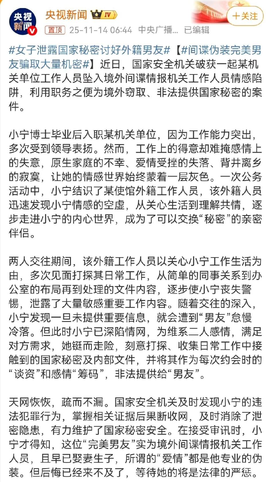 最近国安部披露的案子太让人唏嘘了!博士毕业、机关骨干的小宁,明明前途一片光明,却栽在了一场虚假爱情里 。境外间谍伪装成“完美男友”,抓着她情感空虚的软肋嘘寒问暖,最后把国家机密当成了“爱情筹码”,真是糊涂到家! 咱先不说寒窗苦读十几年的心血白费,单说“讨好男友”这事儿——真正的爱情是相互尊重,哪有拿国家利益换温柔的?普通人都知道守口如瓶,涉密人员咋就拎不清呢? 有时候觉得间谍离我们挺远的,现在看来还真不一定,他们都玩“情感套路”了!要么装深情男友,要么扮知心好友,实则步步套取机密。小米高管都要签保密协议防“套话”,咱普通人更得绷紧弦。 你身边有没有见过太容易相信陌生人的人?如果遇到有人打探涉密信息,你会怎么应对?评论区聊聊,一起给国家安全“把把关”!反间防谍人人有责 国家安全无小事