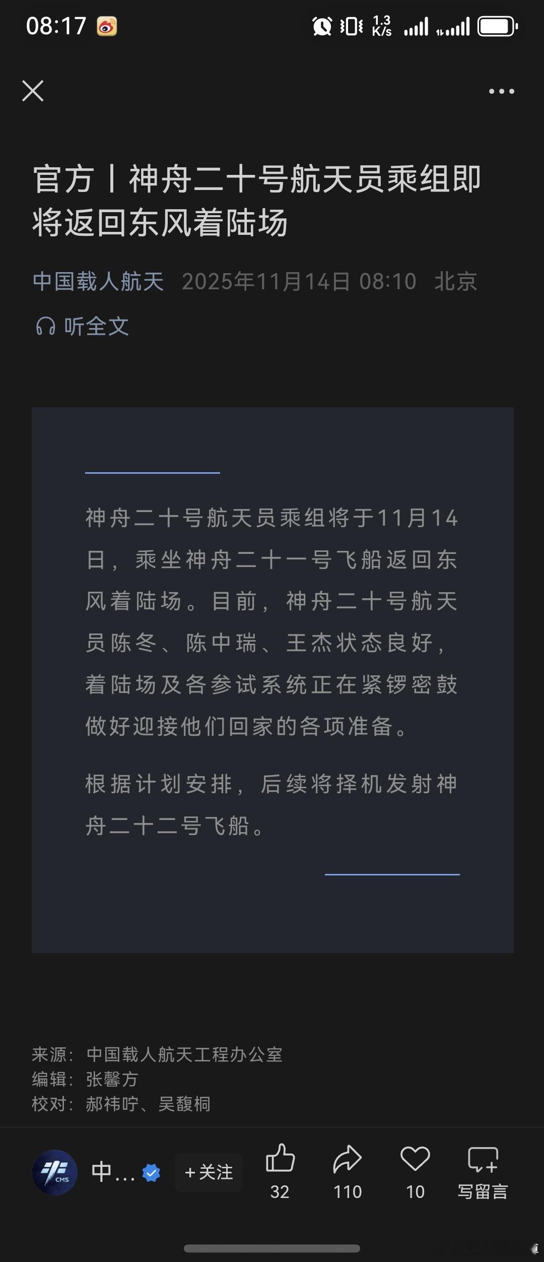 官宣,神舟二十号乘组,将乘坐神舟二十一号飞船返回地球。果然为了稳妥起见,还是不乘坐20号回。只是没想到是20号乘组是先回地球,然后再发备份舱上去。