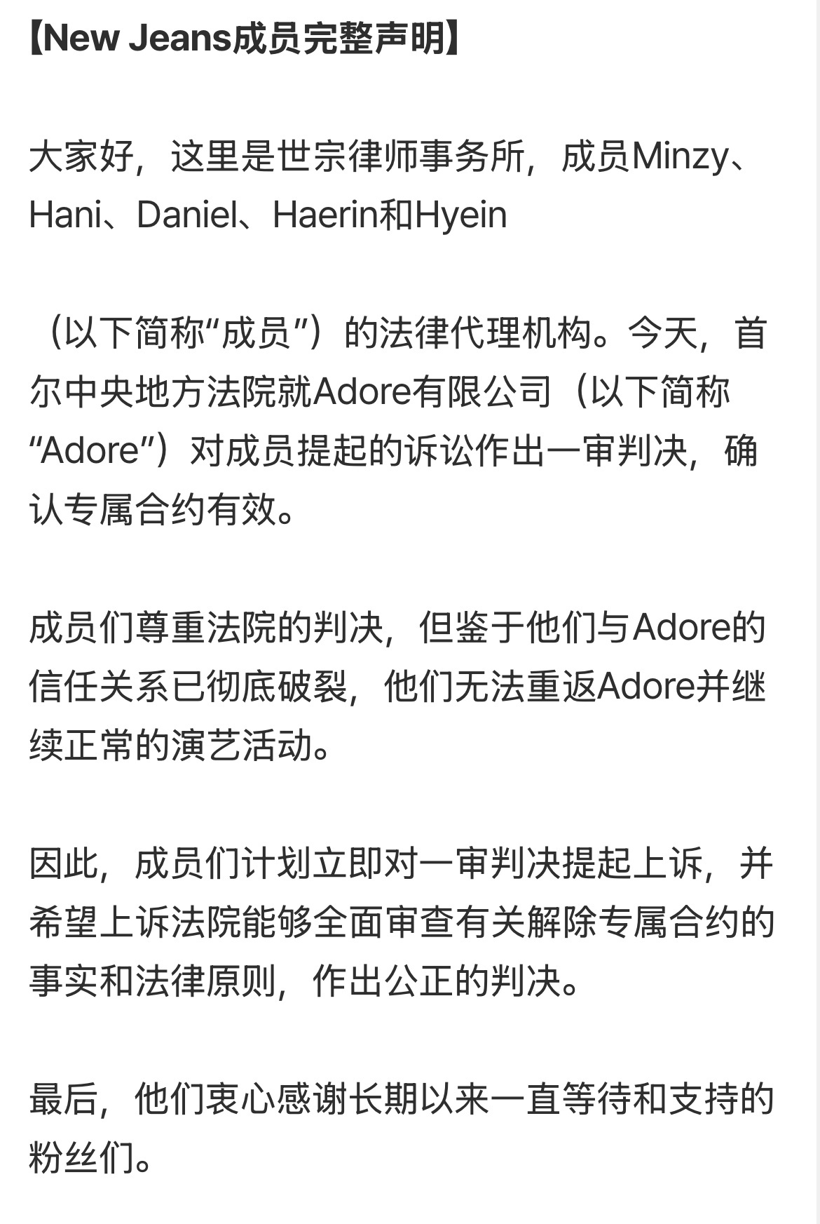 NewJeans放弃对ADOR的上诉了,截止14日凌晨,成员们没有提出上诉状,因此维持原判,专属合约有效期至2029年7月31日。10月30日NewJeans一审败诉,并发声明:“成员们尊重法院的判决,但在与ADOR的信任关系已完全破裂的情况下,回到ADOR并继续正常的演艺活动是不可能的。”“因此,成员们将对一审判决立即提起上诉,并希望上诉法院能够再次全面审视过去的事实关系及专属合约解除的相关法律原则,作出明智的判决。”