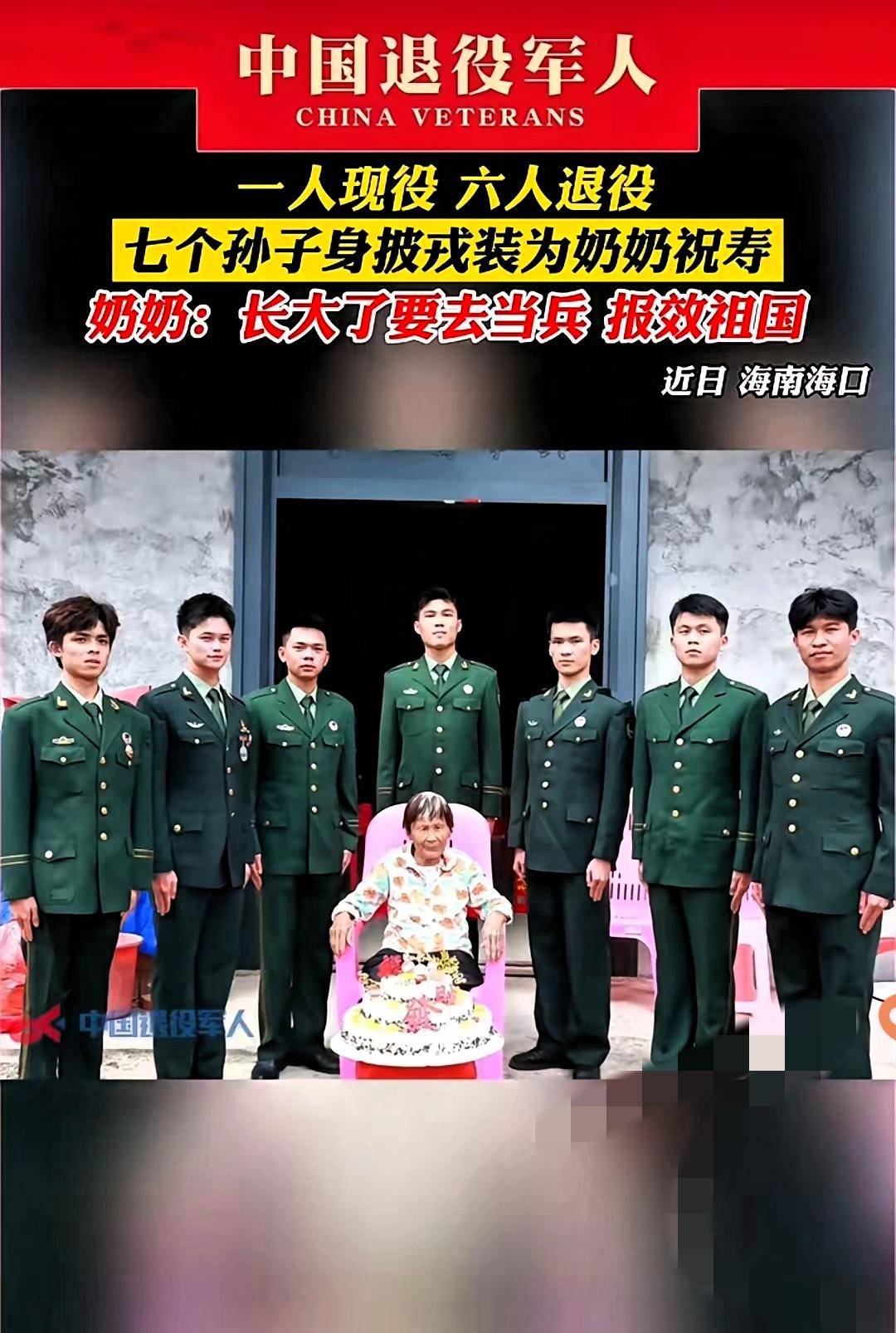 这画面直接看哭!海口奶奶祝寿现场,七个孙子齐刷刷穿军装亮相,一人现役六人退役,这“最强兵哥哥天团”太燃了! 奶奶一句“长大了要当兵报效祖国”,不是随口的口号,是刻进家风的信念。几十年里,她把家国情怀种进孩子心里,让“当兵光荣”成了家族代代相传的底色。 退役不褪色,穿上军装保家卫国,脱下军装仍是热血儿郎。这家人用实际行动证明,爱国从不是空洞的话语,而是融入血脉的传承。奶奶送出的不只是七个孙子,更是七份沉甸甸的家国担当。 这样的家风才是最珍贵的财富,比任何物质都更有力量!你被这满门忠烈的家族感动到了吗?你身边有这样让人敬佩的家风故事吗?来评论区分享~