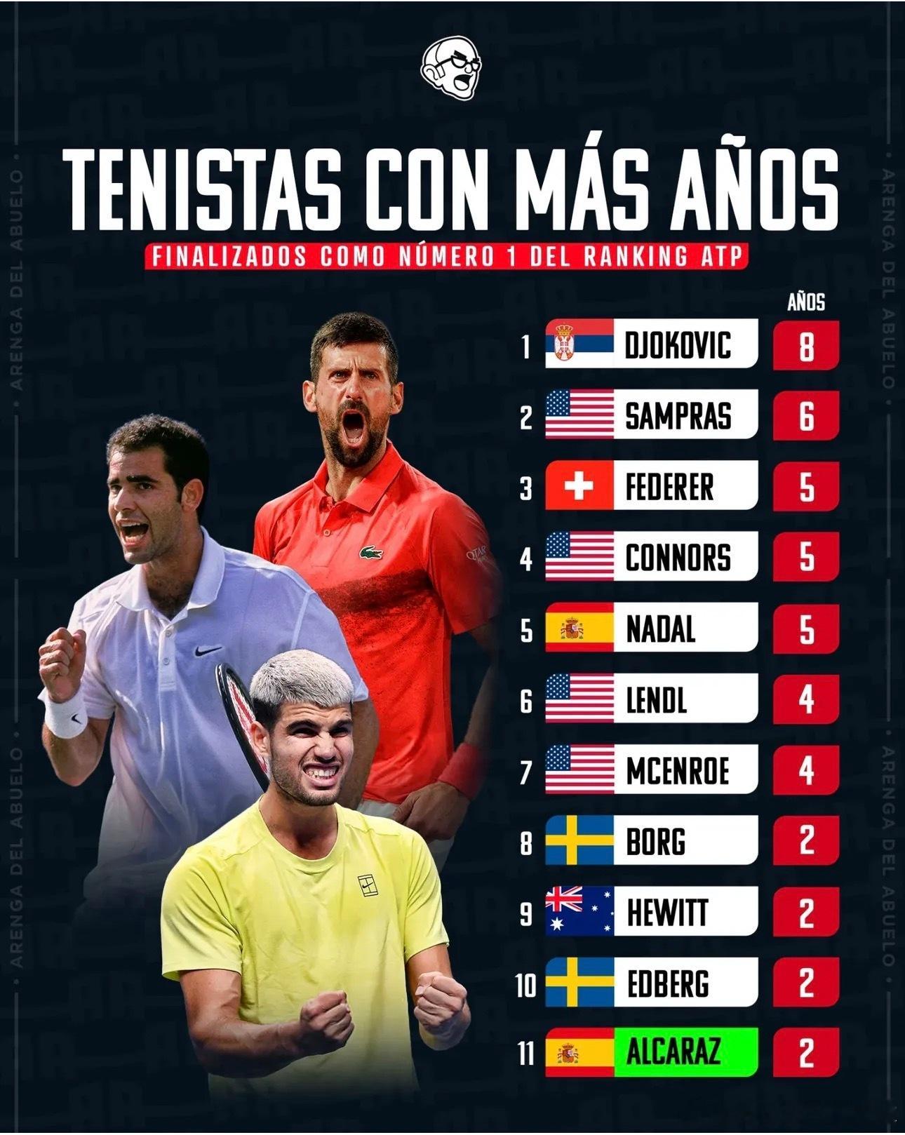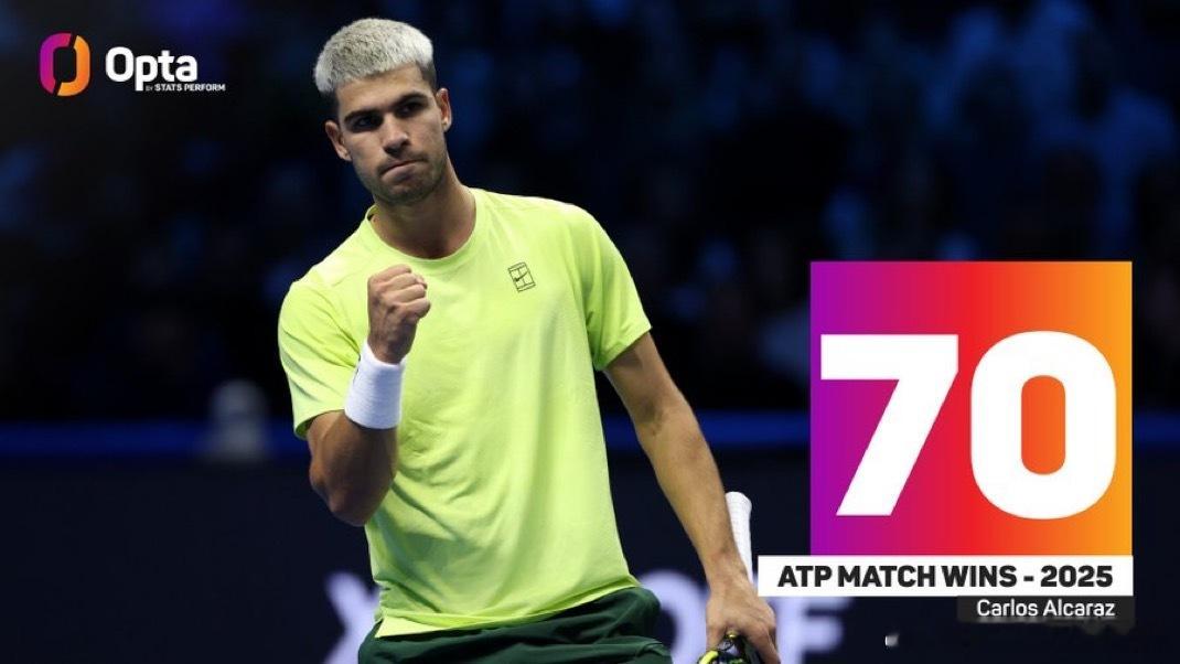 冷知识 阿尔卡拉斯比肩众网球名宿70 场胜利- 卡洛斯·阿尔卡拉斯(22岁188天)是自2009年德约科维奇(22岁164天)以来,在ATP级别赢得70多场比赛的最年轻球员!而且阿尔卡拉斯的总决赛还在继续!因为2025年再次登顶年终世界第一宝座,阿尔卡拉斯也成功加入“拥有6+大满贯和多个年终第一的男子俱乐部”,他也成为有史以来最年轻的俱乐部成员!1️⃣吉米·康纳斯,8-52️⃣比约恩·博格,11-23️⃣约翰·麦肯罗,7-44️⃣伊万·伦德尔,8-45️⃣斯蒂芬·埃德伯格,6-26️⃣皮特·桑普拉斯,14-67️⃣罗杰·费德勒,20-58️⃣拉斐尔·纳达尔,22-59️⃣诺瓦克·德约科维奇,24-8⭐️卡洛斯·阿尔卡拉斯,6-222岁的阿尔卡拉斯还会创造多少记录?