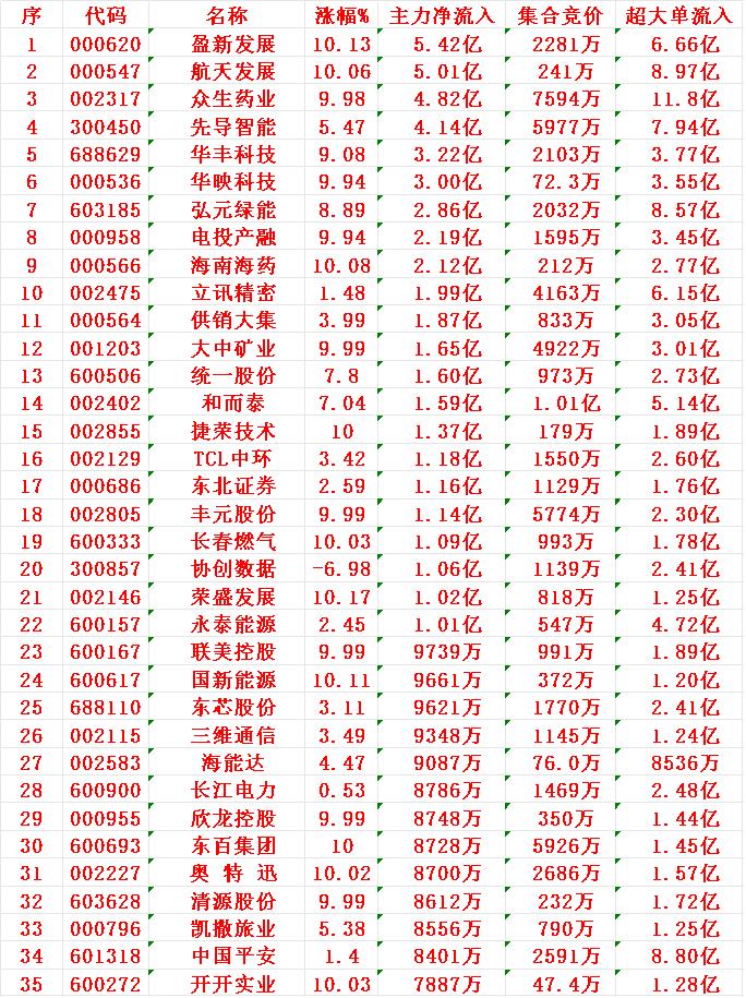 11月14日开盘45分钟,主力资金“买入的 ”的35名单一览! 盈新发展:净流入5.42亿元; 航天发展:净流入5.01亿元; 众生药业:净流入4.82亿元; 先导智能:净流入4.14亿元; 华丰科技:净流入3.22亿元。