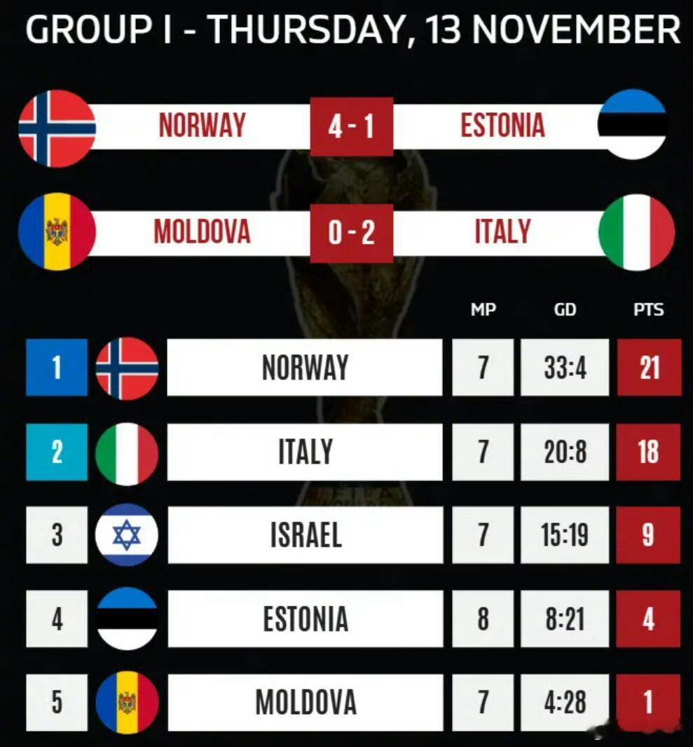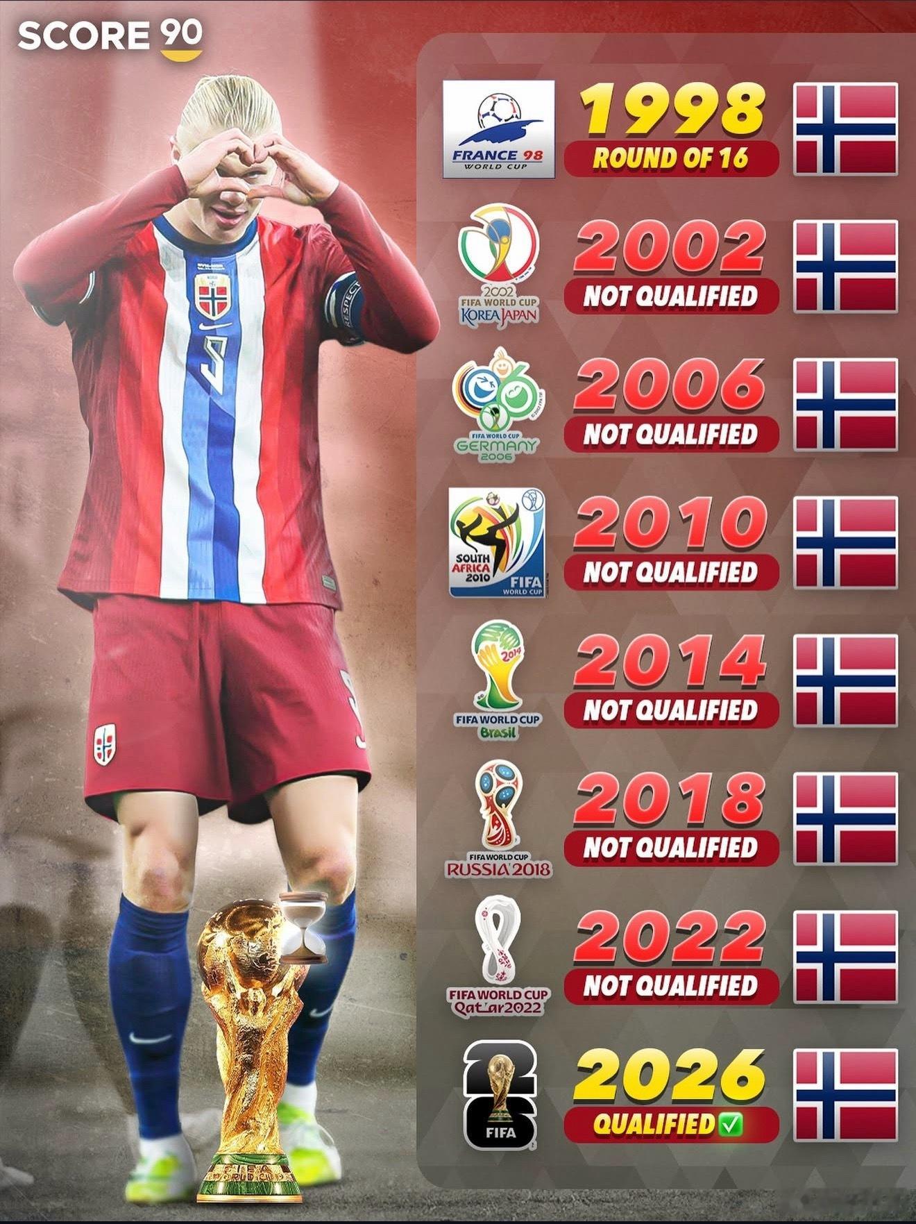 在连续无缘6届世界杯决赛圈之后,挪威队已经提前一轮几乎锁定了2026世界杯门票。挪威国家队上一次征战世界杯决赛阶段是1998年。那个法兰西的夏天,哈兰德和厄德高都还没有出生。别说世界杯,挪威上一次参加欧洲杯,都已经是遥远的2000年。今晨结束的本轮世预赛,挪威和意大利双双获胜。积分榜上,挪威领先意大利3分,最后一轮两队将直接交手,挪威目前领先意大利17个净胜球,意大利想要获得小组第一,必须最后一战赢挪威9球或以上。哈兰德在比赛第56分钟和第62分钟连入2球,至此,曼城前锋本赛季代表俱乐部和国家队出场19次已打入30球,其中代表曼城出场15次打入19球,为挪威国家队出场4次打入11球。哈兰德也成为本赛季首位俱乐部+国家队进球突破30的欧洲五大联赛球员。意大利直接入围世界杯目前只剩理论上的可能,上届卡塔尔世界杯,作为欧洲杯新科冠军的意大利就没有进入决赛圈。这次,意大利基本确定将再次参加残酷的欧洲区附加赛。