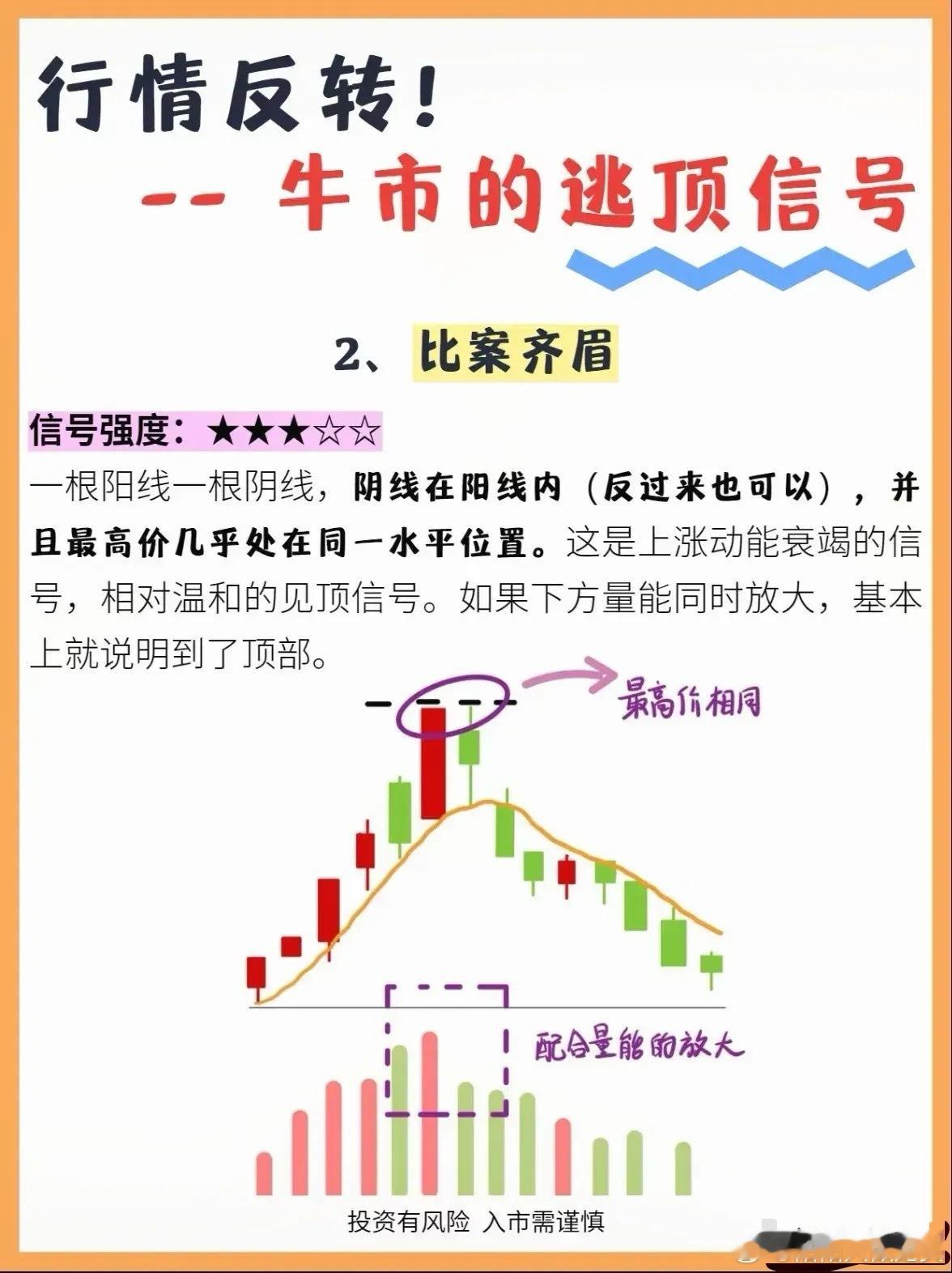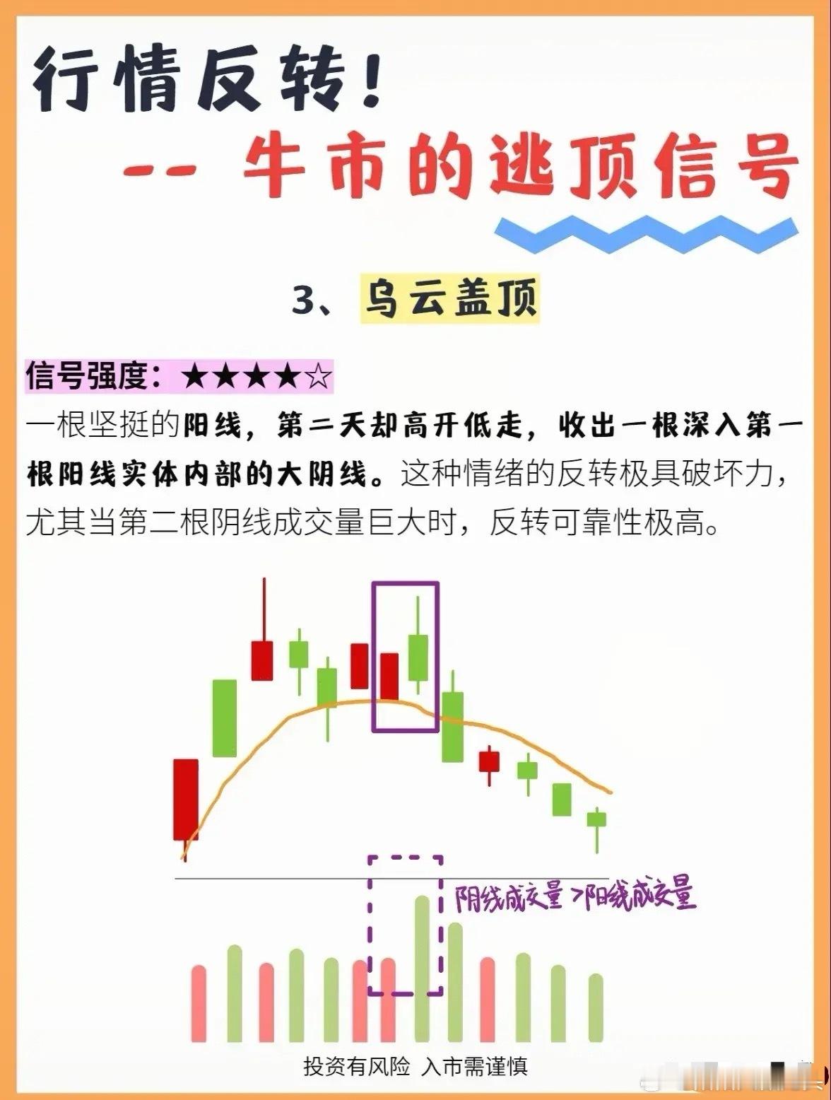 牛市逃顶秘笈:三大经典反转形态捕捉卖点在牛市狂欢中,能够识别行情反转的早期信号,是守住利润的关键。技术分析中的K线形态能为我们提供重要的逃顶参考,以下是三种值得高度警惕的见顶形态:一、巨量长影——多头最后的冲锋这种形态表现为连续上涨后,出现带极长上影线的K线,并伴随巨量成交,俗称“天价配天量”。它意味着多头虽奋力上攻,却遭遇空头强势打压,是强烈的卖出信号。一旦出现,应考虑减仓或清仓,避免利润回吐。二、齐眉双线——动能衰竭的警示由一阳一阴两根K线组成,它们的最高价几乎处于同一水平,形成“齐眉”态势。若阴线实体位于阳线内部,且伴随成交量放大,则表明上涨动能衰竭,顶部特征明显。虽信号相对温和,但仍需警惕趋势反转。三、乌云盖顶——情绪的反转信号首日为大阳线,次日高开低走收出大阴线,且阴线深入阳线实体内部。若阴线成交量显著放大,则形态可靠性极高。这种组合反映市场情绪由多转空,是极具破坏力的反转信号。在实际操作中,结合成交量验证可提高判断准确率。投资有风险,任何技术形态都需结合市场环境综合研判,理性决策才能行稳致远。
