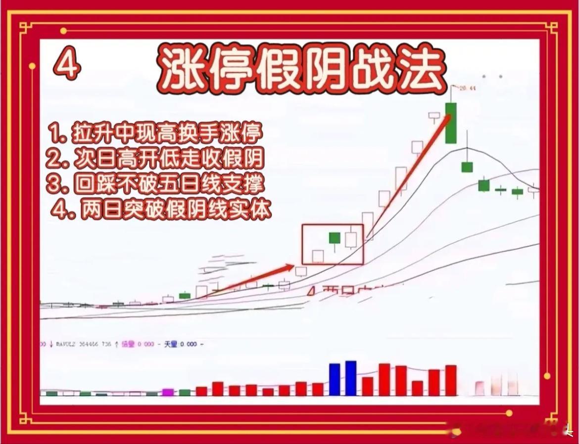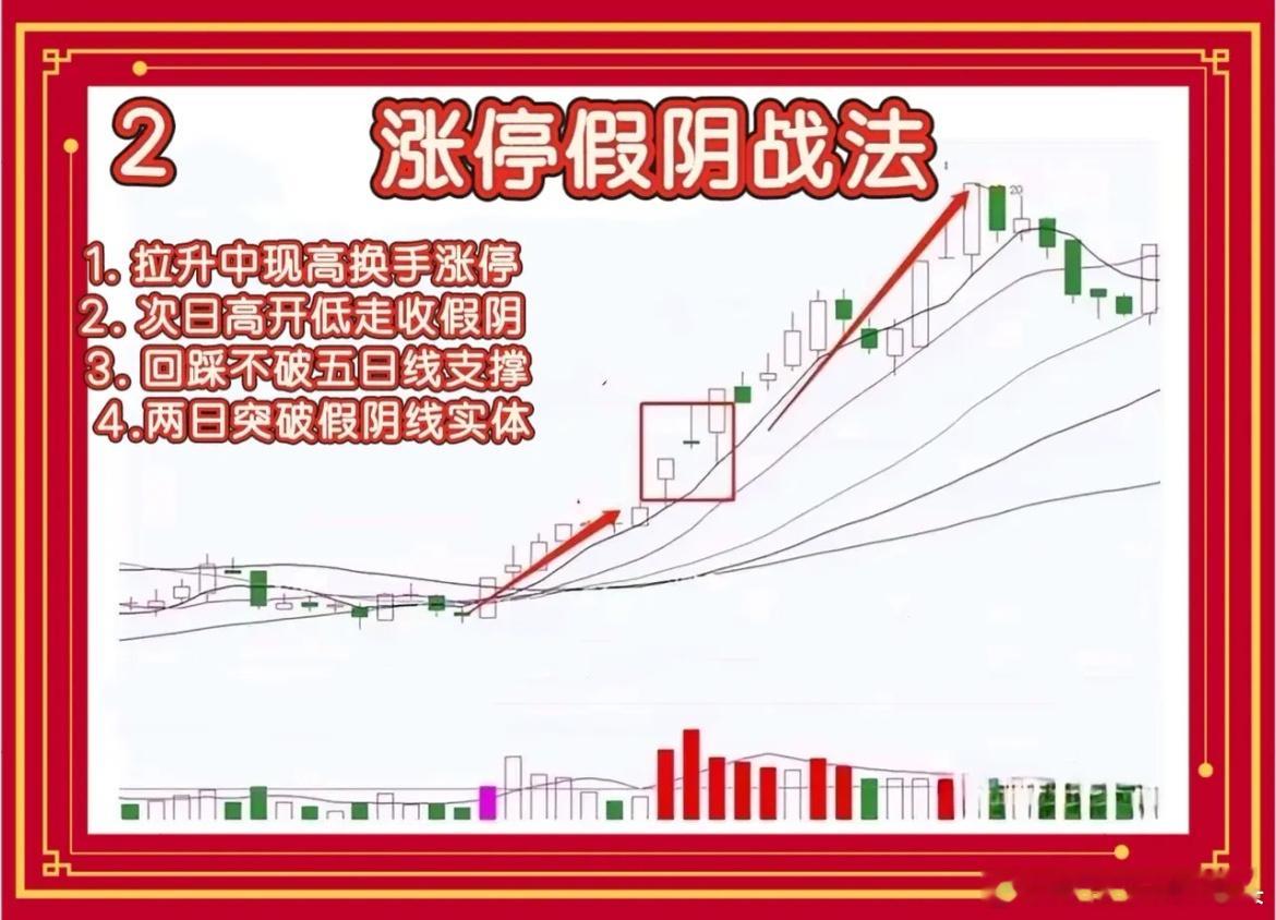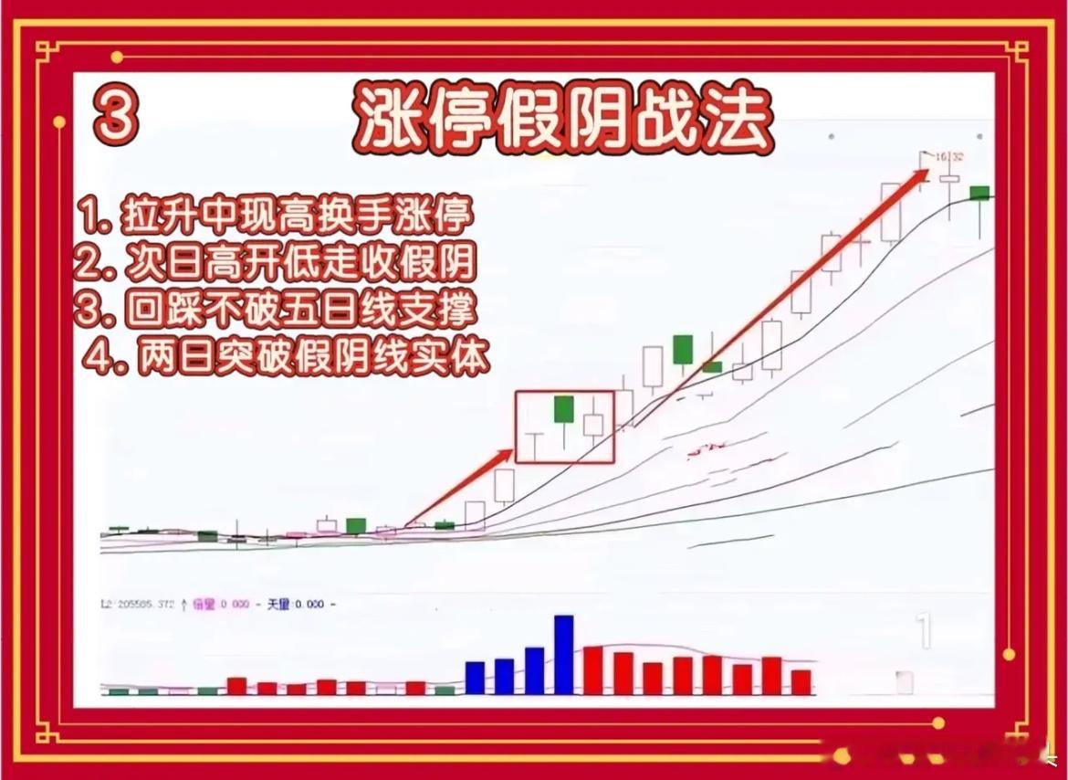 涨停假阴线战法:短线主力拉升前的“黄金信号”今天分享一套实战中屡试不爽的短线形态——“涨停假阴线”。它不是追高风险,而是主力洗盘后的拉升信号,关键在于识别四点核心逻辑:第一,个股处于拉升阶段,出现高换手率的涨停板,注意不是缩量一字板,而是有资金主动进攻的实体涨停。第二,涨停次日高开低走,收盘价却高于前一日涨停价,形成“假阴线”。这不是出货,而是主力故意制造恐慌,洗出不坚定筹码。第三,假阴线回踩不破五日均线,说明下方承接有力,主力控盘节奏良好,趋势未破坏。第四,假阴线出现后两日内,股价突破其K线实体上沿,这是短线主力启动二次拉升的确认信号,后市大概率继续上攻。以上四点,就是“涨停假阴线”战法的完整条件。看似简单,但实战中需结合量能、盘口与板块情绪综合判断,才能提高胜率。如果你也喜欢研究强势股、短线龙头,欢迎关注交流,一起复盘、一起进步。点赞、评论、收藏、转发,都是对原创最大的支持!本文仅供技术思路交流,不构成投资建议。股市有风险,入市需谨慎。