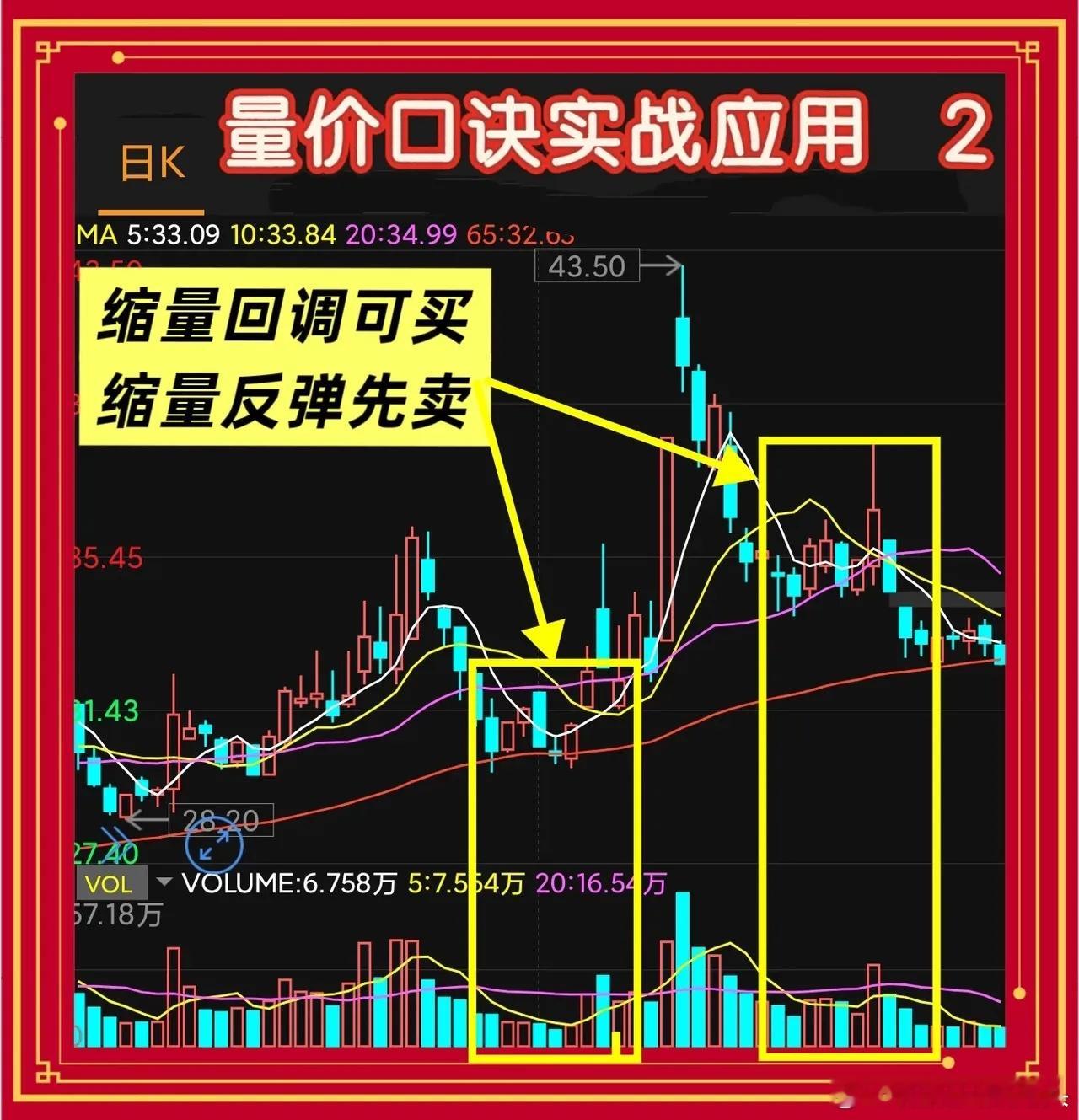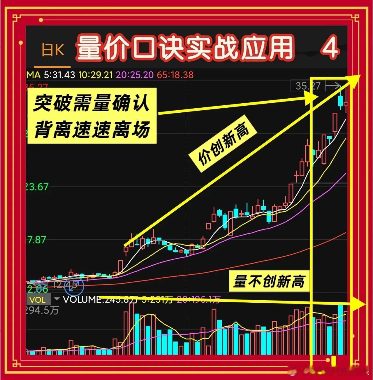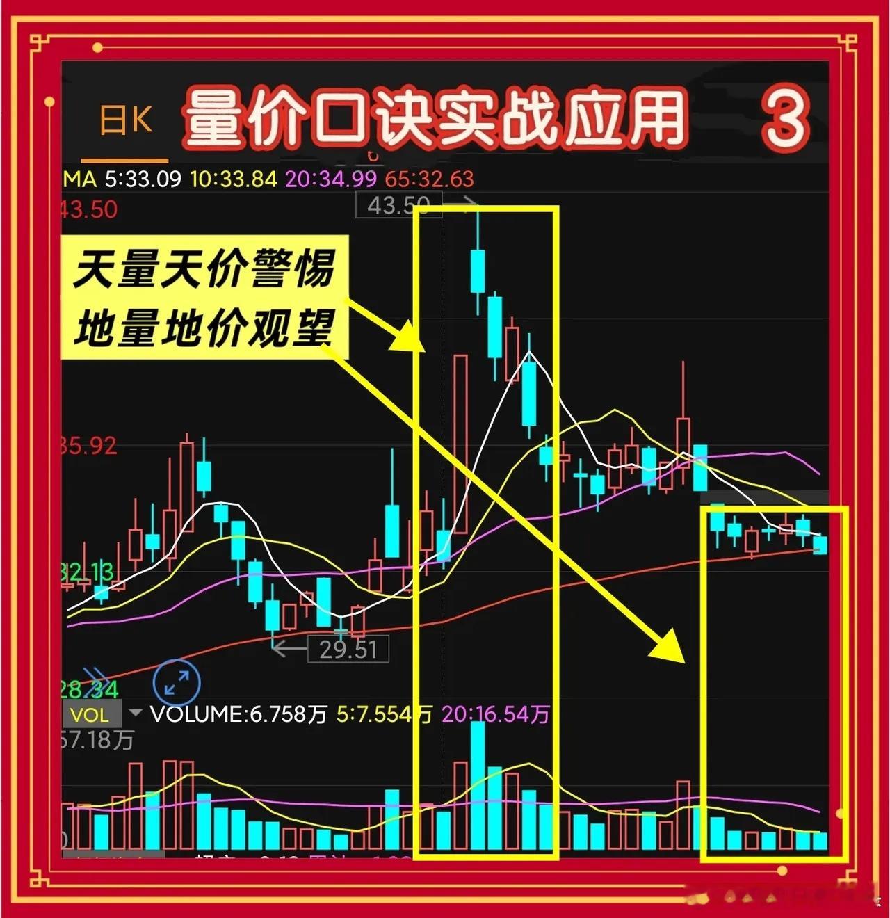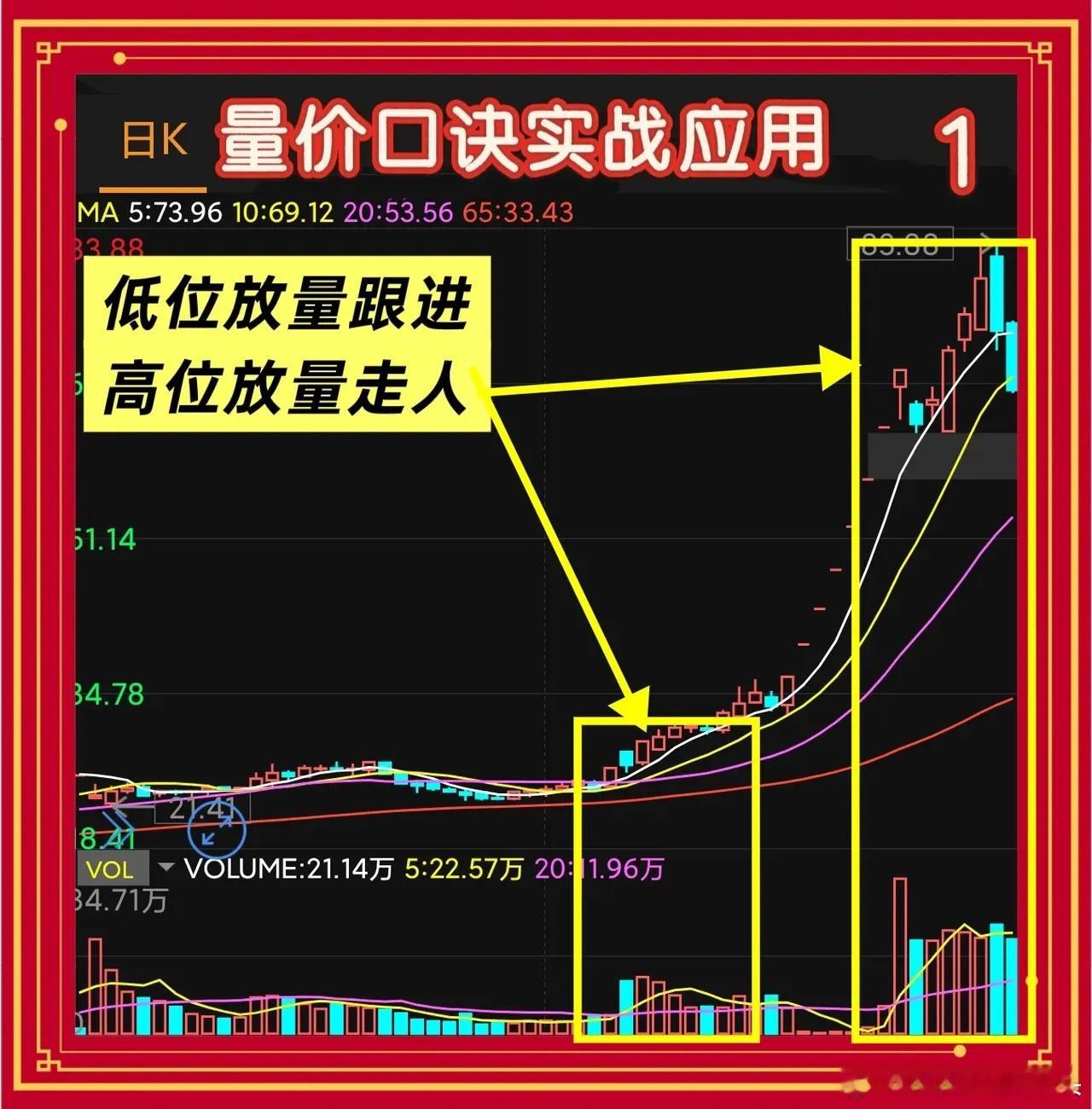 量价口诀实战应用一、低位放量 1. 股价经过一轮深幅回调,成交温和放大,地量金叉初现,为主力建仓信号。 2. 若换手突增至5%~7%,却非缓步推升,多为对倒出货,宜观望。 二、放量破线 1. 长期均线下行后,突然放量长阳突破,可视为新资金进场,底部确认。 2. 若次日量能持续,可小仓位跟进;若快速缩量,则假突破概率大。 三、缩量封板1. 早盘直接缩量封板,主力锁筹良好,后期仍有加速。 2. 若封单巨但反复开板,量缩而换手高,警惕诱多出货。 四、回档缩量 1. 上升途中缩量回踩十日或二十日均线,不破关键位,再放量时为加仓点。 2. 若回档带量,或跌破均线支撑,应及时减仓避险。 五、逆势放量 1. 大盘下行,个股却持续放量走高,多为短线资金抱团,持续性存疑,慎追。 2. 若尾盘随大盘回落且量能迅增,次日低开概率高,宜快进快出。 六、价涨量增 1. 上涨初段量价齐升,趋势健康,可跟随。 2. 高位再度放量急拉,涨幅却收窄,为典型顶背离,逐级止盈。 七、价跌量增 1. 下跌初段放量长阴,资金出逃,不可接飞刀。 2. 连续深跌后突现巨量阴线,随后缩量横盘,或为止跌蓄势,可列观察。 八、天量天价 1. 历史高位放出历史巨量,次日若低开且量缩,顶部特征明显。 2. 天量出现当日留长上影,配合高换手,为经典避雷针,宜果断离场。 九、地量地价 1. 长期阴跌后成交骤减至地量,股价同步新低,空方衰竭信号。 2. 地量出现后若继续横盘,不急于抄底,需等待再次放量阳线确认。 十、分时大单 1. 盘中突现连续紫色大单拉升,但量能未能持续,多为对倒诱多。 2. 若大单后回落不破开盘价,且量能温和递增,可视为试盘,关注次日表现。 十一、区间突破 1. 横盘整理后向上创新高,必须伴随成交量急剧放大,突破才有效。 2. 价突破而量缩,为假突破,应及时退出,防止回踩深套。 十二、成交量警告 1. 上升趋势中量能日渐萎缩,警示多头动能减弱,应降低仓位。 2. 新低或新高伴随清淡成交,可靠性差,不可盲目追涨杀跌。 十三、趋势确认 1. 上行需日益增大的成交量配合,下行需持续缩量确认,反向操作风险大。 2. 任何背离都需警惕,量先价行,不可视而不见。 十四、短线纪律 1. 入场前设好止损位,跌破即走,不抱幻想。 2. 盈利单逢压力逐级减仓,让利润奔跑,同时锁定收益。 十五、心态管理 1. 错过不追高,宁可错过不做错。 2. 连续三笔亏损强制休息,杜绝情绪化交易。 十六、复盘要点 1. 每日收盘后对比量价关系,记录当日最大量能对应的K线形态。 2. 周末统计一周涨幅榜,筛选量价配合良好者加入自选,建立股票池。 十七、实战口诀低位放量跟进,高位放量走人;缩量回调可买,缩量反弹先卖;天量天价警惕,地量地价观望;突破需量确认,背离速速离场。 十八、最后叮嘱所有技术只是概率游戏,市场永远正确,错误的是自身执行。严守纪律,保住本金,才是长期存活之道。觉得有用请点赞、关注、评论、收藏并转发给需要的朋友。本文仅供思路交流,不做投资推荐。股市有风险,入市需谨慎。