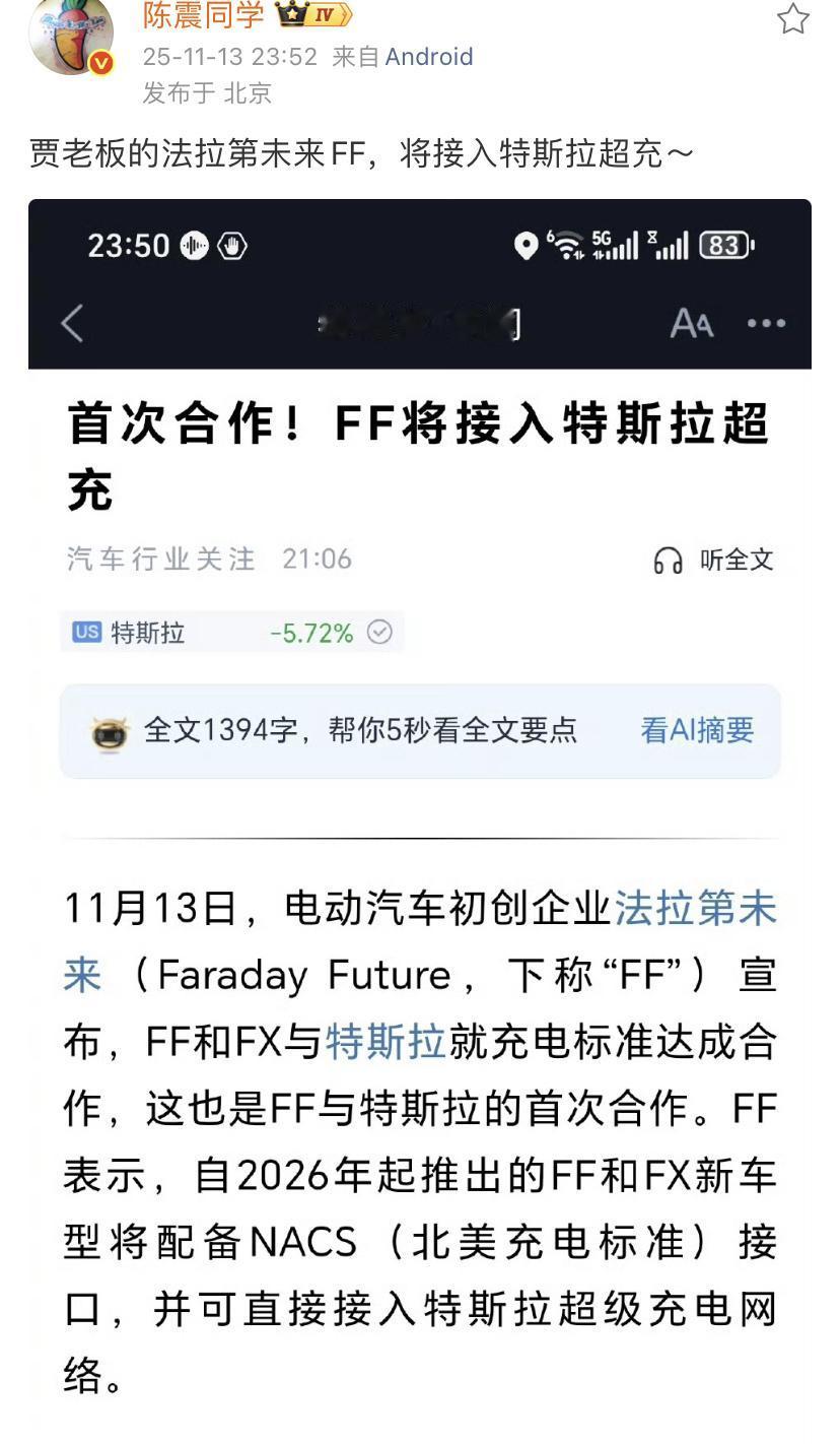 陈震:贾老板的法拉第未来FF,将接入特斯拉超充! 在北美售卖的电动汽车,只有加入特斯拉的超充系统之后才好卖,因为这个标准也是最普遍的,大家都采用特斯拉的标准。 这样等于车型从一发售起就大批的充电桩可以使用,如果自己单独搞一个协议,那么一些接口就不一致了。 各位是怎么看的?欢迎评论区留言。