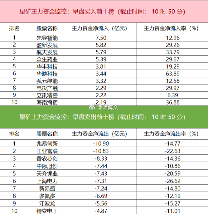 【主力资金监控:兆易创新净卖出超10亿】星矿数据显示,今日早盘主力资金净流入国防军工、公用事业、银行等板块,净流出电子、电新行业、半导体等板块,其中电子板块净流出超100亿元。个股方面,先导智能大涨,主力资金净买入超7.50亿元位居首位,盈新发展、航天发展、众生药业获主力资金净流入居前;兆易创新遭净卖出超10亿元,工业富联、香农芯创、中际旭创资金净流出额居前。