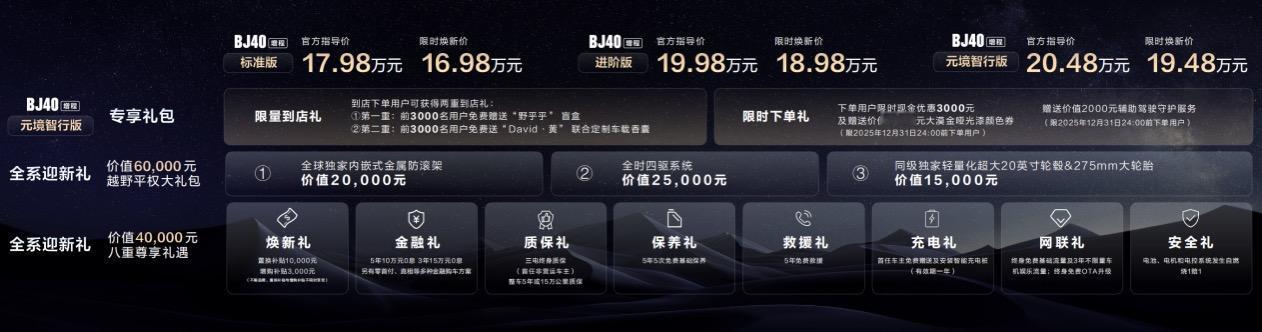 11月13日,国家网球中心,北京越野BJ40增程用户之夜暨新品发布会在此上演硬派与智能的双向奔赴。全新元境智行版官方指导价20.48万元,叠加国补与置换后限时焕新价19.48万元,加上标准版、进阶版组成的完整家族,再携两大迎新礼而来,这份诚意着实让人眼前一亮。 价值六万元的越野平权大礼包堪称“闭眼冲”福利,全球独家内嵌式防滚架、全时四驱,连1.5万元的20英寸大轮毂都免费送,直接拉低硬派越野门槛;“烧一赔一”的热失控承诺更显底气,整车赔付+全费用覆盖,把用户顾虑彻底打消。现场16位“车主之最”的故事尤其动人,从最长续航到最久等待,让BJ40增程早已超越代步工具,成为承载热爱的精神符号。 作为硬派增程SUV的开创者,BJ40增程元境智行版真正做到了“全能无短板”。三把差速锁+智能全时四驱,45度陡坡轻松攻克,颠簸路段无感通过,专业越野实力不打折;而152km纯电续航+1200km综合续航,百公里1.33L油耗,让城市通勤成本低至几分钱,彻底打破“越野费油”的刻板印象。1.964米车高带来的“擎天柱视角”、1.7米双人平床、BBA同款零重力座椅,把实用与舒适焊死在车身上。 北汽越野智能突破纯视觉方案搭配26个高精度传感器,同级独有的高快NOA、记忆泊车等功能,让硬派越野不再是“老司机专属”;骁龙8155芯片加持的双15.6英寸大屏,流畅度堪比旗舰手机,AI语音秒接梗的体验更是加分。加上“玄武护甲”三重电池防护和贯穿式防滚架,安全底线拉满。 从野乎乎滑雪版IP的推出,到万元限时权益的诚意,北京越野用67年硬派基因融合增程技术,让越野从小众爱好变成全民可及的生活方式。如今交付量破三万的成绩,正是市场对这份“越野行、不越野也行”全能实力的最佳认可。硬派SUV的未来,果然要看这种懂用户、肯投入的真心之作。【来自懂车帝车友圈】