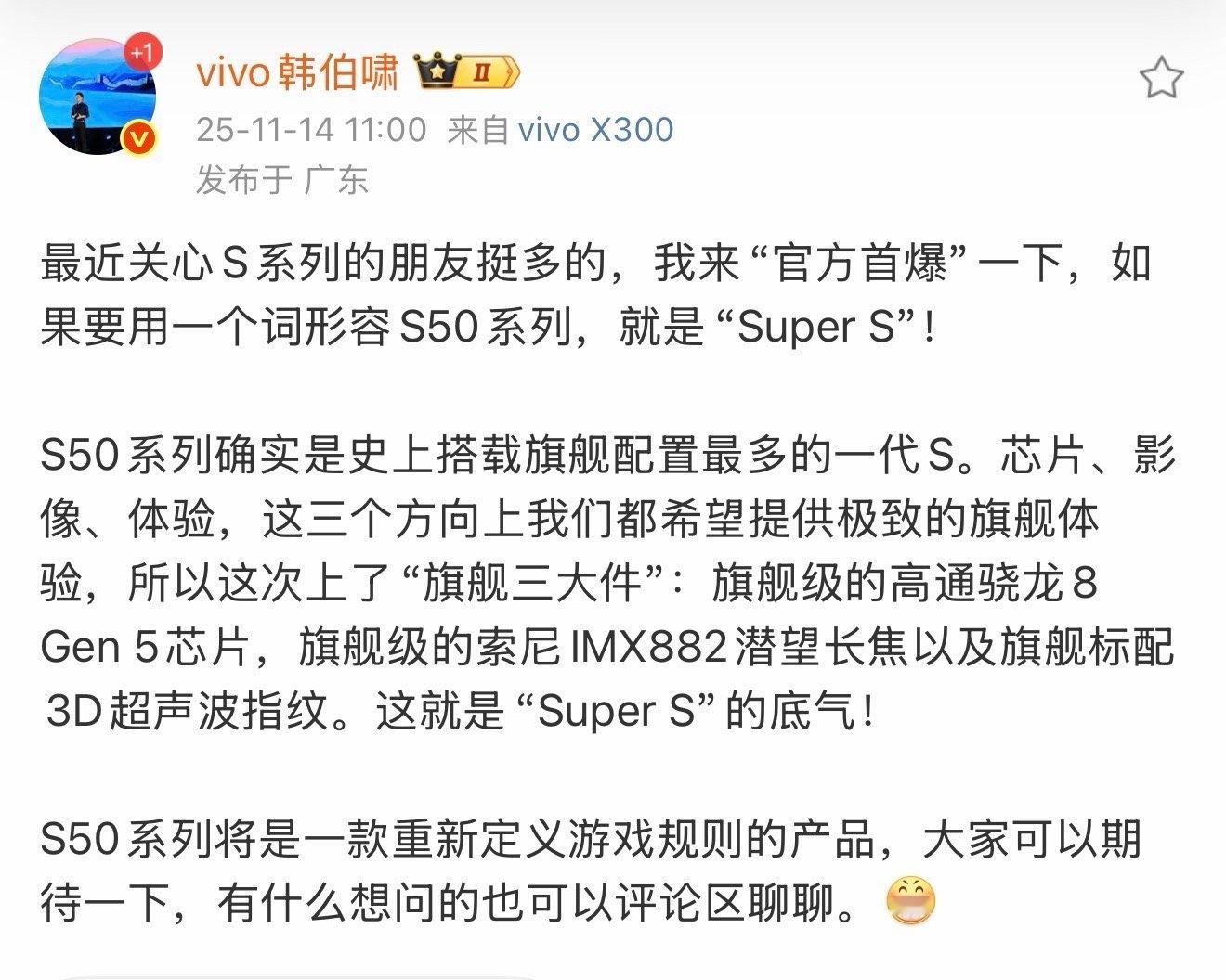 vivo S50系列都这么顶了…高通骁龙8 Gen 5芯片索尼IMX882潜望长焦3D超声波指纹