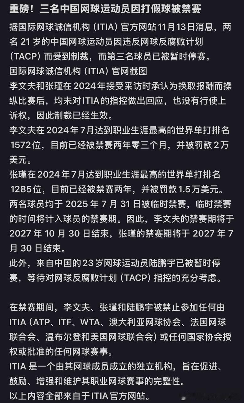 三位中国球员假球禁赛🇨🇳李文夫在2024年7月达到职业生涯最高的世界单打排名1572位,目前已经被禁赛两年零三个月,并被罚款2万美元。🇨🇳张瑾在2024年7月达到职业生涯最高的世界单打排名1285位,目前已经被禁赛两年,并被罚款1.5万美元。两名球员均于2025年7月31日被临时禁赛,临时禁赛的时间将计入球员的禁赛期。因此,李文夫的禁赛期将于2027年10月30日结束,张瑾的禁赛期将于2027年7月30日结束。此外,来自中国的23岁网球运动员🇨🇳陆鹏宇已被暂时停赛,等待对网球反腐败计划(TACP)指控的充分考虑。在禁赛期间,李文夫、张瑾和陆鹏宇被禁止参加任何由ITIA (ATP、ITF、WTA、澳大利亚网球协会、法国网球联合会、温布尔登和美国网球联合会)或任何国家协会授权或批准的任何网球赛事。