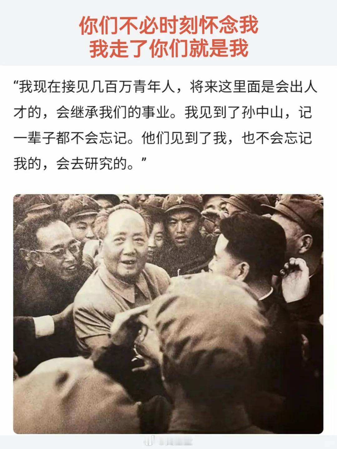 你们不必时刻怀念我,我走了你们就是我!你们不必时刻怀念我,我走了你们就是我!我现在接见几百万青年人,将来这里面是会出人才的,会继承我们的事业。我见到了孙中山,记一辈子都不会忘记。他们见到了我,也不会忘记我的,会去研究的。