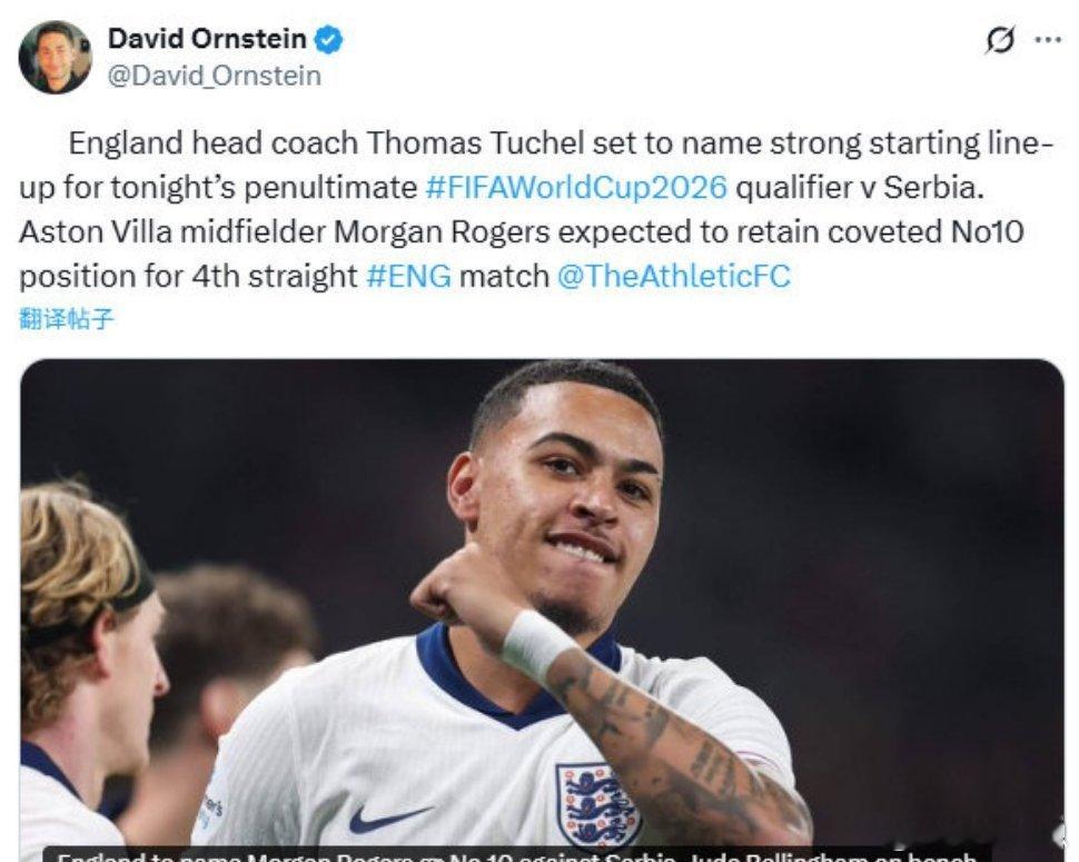 【图赫尔的头号爱将】TA名记DO爆料:尽管已经提前晋级2026世界杯,英格兰主帅图赫尔依然会派出强大的首发阵容,出战对阵塞尔维亚的世预赛,维拉中场摩根罗杰斯将会连续四场国家队比赛,出现在10号位,这个位置的竞争对手包括贝林厄姆、福登、吉布斯-怀特以及受伤的帕尔默。