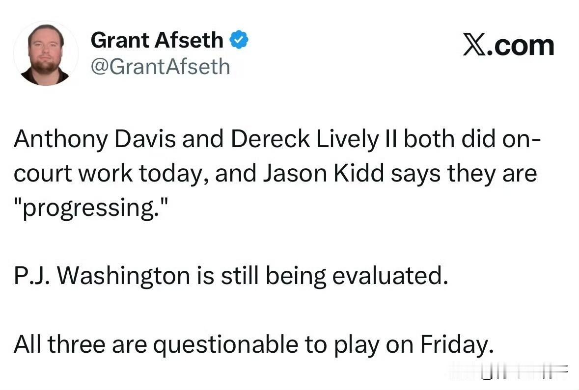 浓眉复出打快船???浓眉和莱夫利比赛状态升级! 北京时间11月15号,独行侠将在主场迎战弱旅快船队,两支球队半斤八两,这次终于碰面了,一个倒数第二,一个倒数第四,双方会把擦出怎样的火花呢? 这应该是一个好日子,至少有一支球队会结束连败的阴霾,也是提升球队士气的好机会,独行侠这边也迎来了好的消息。 主教练基德表示,浓眉和莱夫利恢复进展顺利,他们今天都参加了训练,周六和快船的比赛他们的状态也升级为出战成疑。 同样的还有前锋华盛顿,这家伙今夏签了大合同还不赶紧出来表现一下证明自己,难道都喜欢签完合同养伤吗?[捂脸][捂脸][捂脸] PJ华盛顿也是出战成疑的状态,祝他们哥三个早日康复,加油! 快船 快船队 独行侠 戴维斯