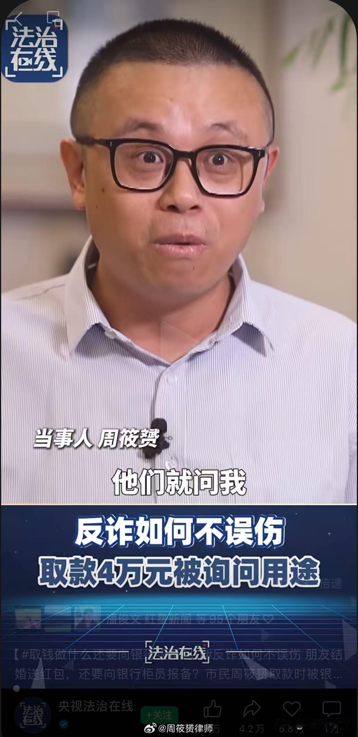 【这篇文章作者,简直就是周筱赟律师的嘴替!】 有银行柜员推荐了一篇文章给我,见附图01。我不认识这位作者。作者是对我昨天中午发布的《周筱赟律师致全国各银行柜员们:我不会辜负你们的!》 的分析。 我没想到作者分析的非常到位!简直就是我的嘴替啊!他对我心态的分析,对未来的预期,说出了我没有完全说出的话。这个社会,需要正义的声音。如果每个人遇到不公正时,都能勇于站出来发声,这个社会就会比现在更好!这就是我一直非常推崇,并努力身体力行的“通过个案推动制度建设”。 另外,他引述了华商报大风新闻昨天下午最新报道:建设银行东营分行,已经明确表示,对于客户取款金低于5万元,已经不再询问来源和用途。社会进步,是一点点争取来的。 周筱赟律师 写于2025年11月14日凌晨,贵州出差办案中