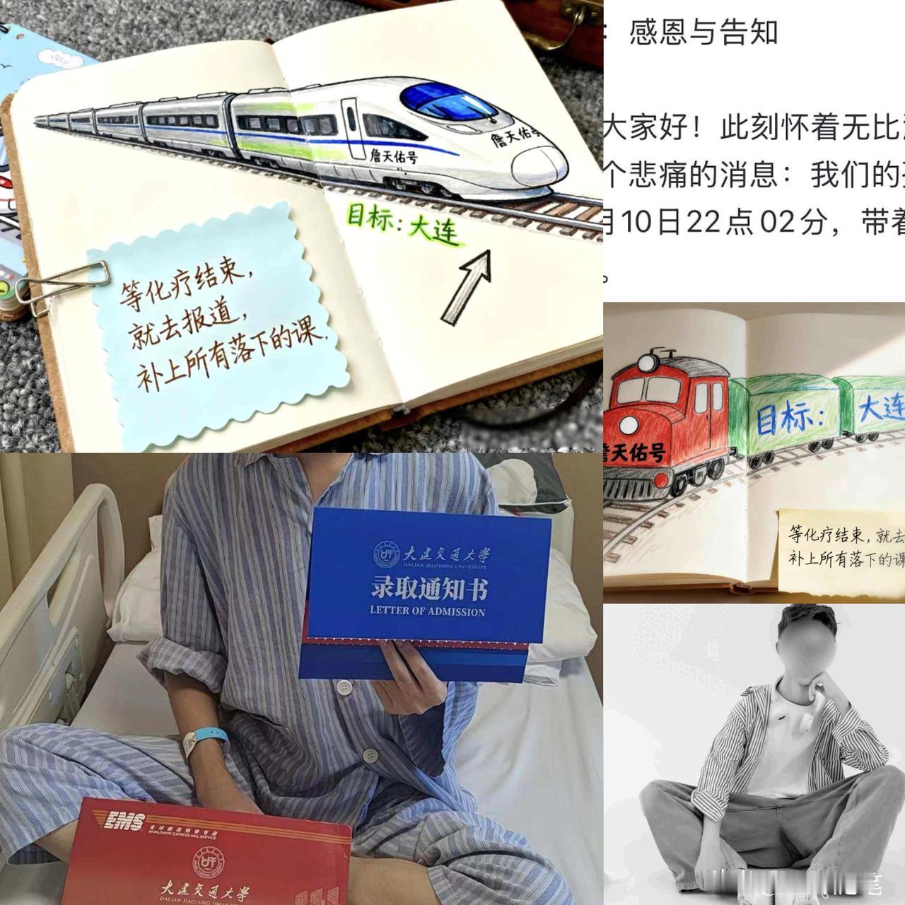 安徽少年拿到大学录取通知书不久后病逝,父亲:他画去学校的火车,激励自己撑过化疗! 说实话,我昨晚刷到这条新闻时,愣是盯着手机屏看了好久。 这个叫詹某的安徽少年,临走前还趴在病床上画一列开往大连的火车。 他给车头认真标上“詹天佑号”——那是他拼了命考上的大学,却一趟都没能坐上的列车。 高考587分,大连交大的通知书就压在他枕头下。可这个十八岁的孩子,从备考起就发着烧硬撑,考完十天才查出得了噬血细胞综合征。 在上海的医院,他做了六轮化疗,没喊过一声疼。笔记本里夹着张纸条,写着“化疗结束就去报到,把课补上”。后来手没力气了,家人就帮着他画那列永远向前开的火车。 干细胞移植后病情恶化,11月10日晚上,他还是没撑过去。 最让我鼻酸的是他父亲那句话:“我们不接受捐款了,留给更需要的人吧。”这孩子自己都在生命最后时刻,用画笔跟命运较着劲——他画的不是消遣,是“我偏不认输”的仪式感。 最后一句我的想法:其实哪是什么英雄故事啊,就是一个普通孩子,在连呼吸都疼的时候,还死死攥着那张通知书当行李。真没想到,一列画出来的火车,竟成了他开往明天的唯一班次!
