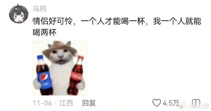 看都是一个很扎心的评论“没对象就算了,一人喝两杯都要被说”“我不仅能喝两杯还可以再吃两个汉堡”哈哈哈哈哈哈哈哈哈
