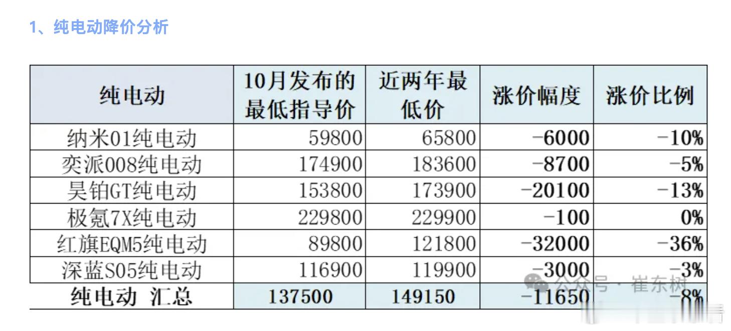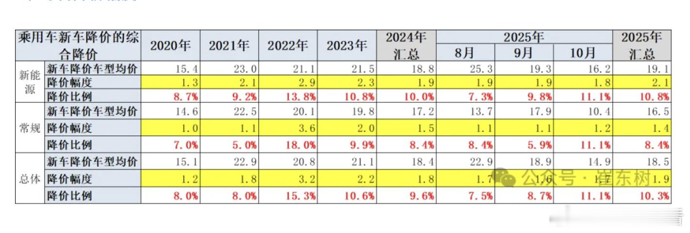 等等党又赢麻了?10月新能源新车降价幅度超11%!11月14日消息,乘联分会秘书长崔东树在近日发文称,今年10月,新能源车新车降价车型的降价力度算术平均达到1.8万元,降价力度达到11.1%今年前十个月,新能源车市场的降价力度也明显加大。据崔东树的统计,1-10月新能源车新车降价车型的平均降价幅度为2.1万元,降价比例约为10.8%,仅次于2022年的13.2%。与整体市场相比,新能源车的降价幅度也更大。今年前十月,常规燃油车新车平均降价1.4万元,降价比例8.4%;总体乘用车市场平均降价1.9万元,降价比例10.3%。此外,根据乘联分会的统计,在今年10月降价规模14款车中,纯电动车型6款,较去年同期增加了4款。纯电动车型新车降价后的均价是13.8万元,降价幅度达到1.2万元,新车降价力度达到8%。插混车方面,新车降价后的均价是21.8万元,降价幅度达到4.2万元,新车降价力度达到19%。而从细分车型来看,无论是纯电动还是插混,国央企的新车降价动作都幅度更大。比如纯电动车方面,降价幅度最大的是红旗EQM,其最低指导价下探至8.98万元,比两年前最低价低36%。 (原创/欢欢)