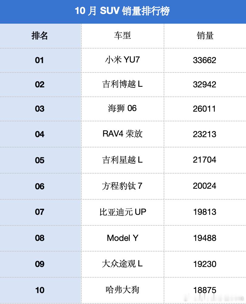 10月销量大厮杀,YU7取代Model Y、宏光干翻比亚迪。过了金九银十,今年的传统的销量旺季基本也就结束了,各细分市场的榜单也陆续出炉。小编为大家整理了一份轿车、SUV和MPV的销量排行。这次三种车型的销量排行变化还是挺大的,先说轿车,宏光MINIEV当之无愧是老大哥,断崖式领先后面的兄弟们,吉利星愿也紧随其后,位居第二,把比亚迪热销的三款车型统统甩在身后。在SUV榜单,小米YU7爆发了,抢占了Model Y的市场,位居车型市场第一名,吉利博越L也紧随其后,与YU7差距不大。MPV榜单中,魏牌高山也首登榜单第一,超越了常年霸榜的别克GL8系列和丰田赛那SIENNA。过去的十一购车季,各位友友买车了吗?