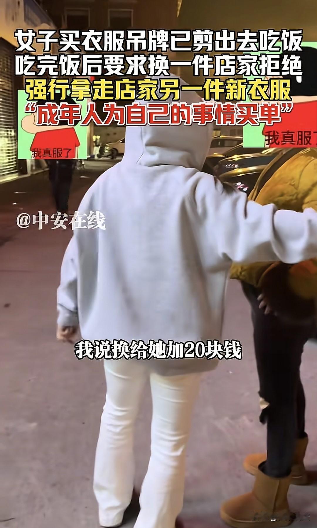 “活不起了?”江苏南通,女子买完新衣服,吊牌剪掉后,出去吃饭,2小时后,回来找店家要求换一件,店主气愤:你穿2个小时了,要跟我换,凭什么给你换。女子理直气壮,不说给你加20块钱嘛,说完扔下衣服,强行拿走另一件衣服穿上就走,店主气的追了出去…网友:这玩意把七天无理由带到线下了? 某服装店店主卖了很多衣服,却不想,这次她遇到了一个“无赖”顾客,可给她气坏了。 事情是这样的,一个年轻女子来到店里买了一件马甲,穿上试试觉得不错,就没有脱下来,直接就买下了,然后,说她要出去吃饭。 万万没想到,大概过了两个小时后,女子吃完饭回来了,把马甲扔在店里柜台上,和店主说要换一件。 店主都惊呆了,简直不敢相信自己的耳朵,她看了一眼马甲,吊牌都剪了,于是,直接拒绝道:“不可以换的。” 可没料到,女子大言不惭的来了一句:“我在哪里买衣服都可以换,为什么你家不可以?” 店主和她讲明,衣服吊牌都剪掉了,不可以换了,毕竟这属于旧衣服了,也没法再卖了。 可女子接下来一个举动直接给店主惹怒了。 女子竟然强行拿走店里的另一件衣服,直接穿上走了。 店主当时反应也快,立马拿着手机打开录像迅速追了出去,跟在女子沟通直接大声对她说:“你买了一个衣服,穿了2个小时出去吃饭了,说要来跟我换一件。” 店主大声说话立马引起周围的人观看。 不曾想,女子穿着衣服压根没有脱下来的意思,可能怕丢脸,还把衣服上的帽子戴上了。理直气壮地说:“我说给她加20块钱。” 店主一听这话都气笑了,直接反驳道:“我为什么要你的钱?你为自己的事情买单,成年人了好不好,一件衣服我卖给谁啊?我们家从来不把旧衣服卖给人家,你穿过的我凭什么卖给人家?” 可女子似乎根本不在乎,反而一直往前走,不知道跟前面的人说着什么…… 事后,店主解释事情经过,是那女子买了一件马甲,吃完饭后,又来换,我没同意,她拿起我一件衣服就穿走了,所以我追了出去,才有了这个视频。 店主越说越气,那女子穿出去吃饭了,吊牌剪完了她才来的,那怎么可能给她换呢! 店主把视频发在网上后,也引起大家的讨论。 不过,店主到底要没要回衣服视频中没有讲,估计应该能要回来。 正常来说肯定不可以换,衣服穿着吃饭都有味道了,而且吊牌也剪掉了,谁不知道,吊牌没了不退不换。 有人说,活不起了,这样搞,支持店主,要是都像女子这样,那对下一个消费者就不公平了。 可能女子网购经常这么干,在线下也想这么干。 还有人调侃,这玩意把七天无理由带到线下了?7天无理由的风,吹到了实体店。 有网友分享:我遇到过一个更离谱的,冬天最冷的时候来买的羽绒服,穿着走的,过了二十多天,那段时间天气回暖了,一个男的带着那女孩来退羽绒服了,说是现在天气热了谁还穿羽绒服啊,非要退。 还有网友分享:我认识一个人她买了三四套衣服去旅游,还是在夏天,她还胖出一身汗,然后给人家退回去。然后,她和我说我都震惊了,现在绝交了,人一方面有问题,她整个人品都是不咋地的。 从法律方面,衣服吊牌剪了,店家可以拒绝退换吗? 吊牌是商品完整性的重要标识,剪掉后可能被商家认定为“影响二次销售”。 《消费者权益保护法》第24条规定:经营者提供的商品或者服务不符合质量要求的,消费者可以依照国家规定、当事人约定退货,或者要求经营者履行更换、修理等义务。 退换货需保证商品“完好”,但“完好”的判断标准通常以商品功能、外观是否受损为准,而非单纯以吊牌是否完整为唯一依据。 实体店退换货的核心条件是“商品质量存在问题”或“商家明确承诺无理由退换”。 此事中,女子因个人原因,可能穿着后以不满意为理由要求换货,但是,马甲无质量问题,那么店主有权拒绝换货。 另外,女子与店主已就马甲完成交易,双方形成买卖合同关系。 此事中,女子试图以“加价20元”作为换货条件,但未与店主达成新合意,擅自取走衣服的行为属于单方变更合同内容,违反原合同义务。 女子在店主明确拒绝换货后,未经允许强行拿走另一件衣服并穿走,属于“公然夺取”他人财物。 若衣服价值达到当地抢夺罪立案标准,且女子主观上具有非法占有目的,如拒绝归还或支付,则可能构成抢夺罪。 即使女子声称“加20元”,但店主已明确拒绝交易,其强行取走行为仍属非法占有。 如果,衣服价值较低(如不足立案标准),女子强行拿走店里衣服的行为可能违反《治安管理处罚法》第49条:盗窃、诈骗、哄抢、抢夺、敲诈勒索或者故意损毁公私财物的,处5日以上10日以下拘留,可以并处500元以下罚款;情节较重的,处10日以上15日以下拘留,可以并处1000元以下罚款。 因此,店主如果要不回衣服,可以报警处理。 关注@福康说法 从日常点滴学法律,生活安稳更有底