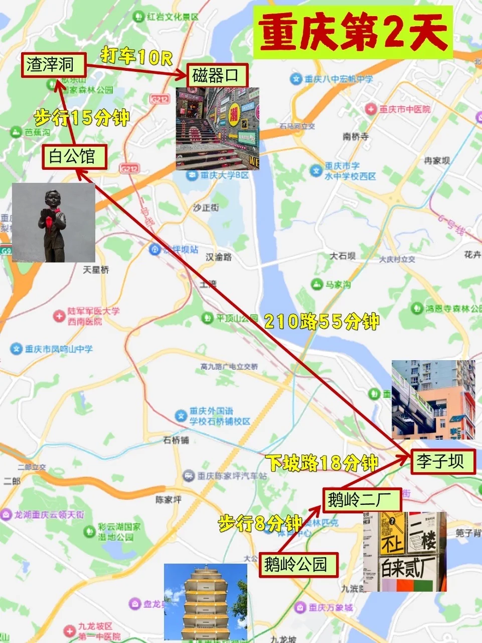 第2️⃣天:鹅岭公园——鹅岭二厂——李子坝——白公馆——渣滓洞——磁器口古镇