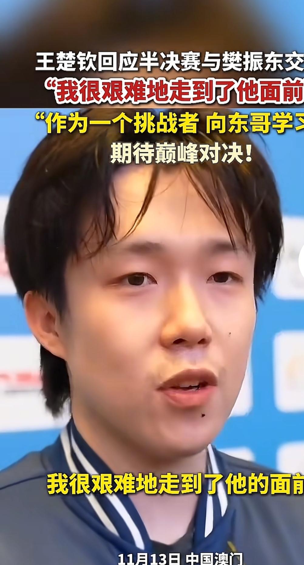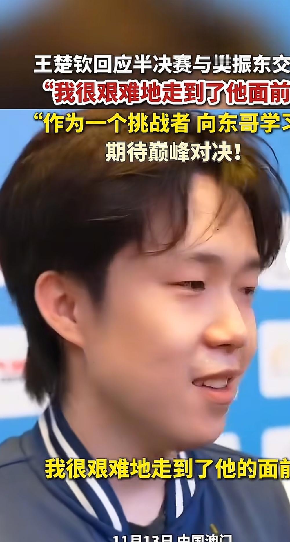 不得不感叹,大头真是双商在线, 接受记者采访, 回答滴水不漏, 全运会如火如荼, 男单四强也随之诞生, 大头和小胖半决赛提前相遇,巅峰对决, 胜败很难预测, 当被记者问到面对对手樊振东时, 大头的回答让人喜欢, 他说:我很艰难的走到他的面前, 也是事隔很久再度和东哥交手, 看到他这一次比赛, 依旧保持着世界最高水平的竞技状态, 我作为一个挑战者来向他学习。 情词恳切, 把自己的位置摆的很低, 谦逊平和, 没有世界第一的傲气, 这份谦和态度的确让人佩服。 无论结果输赢, 努力了,奋斗了,拼搏了, 就是真正的胜利。