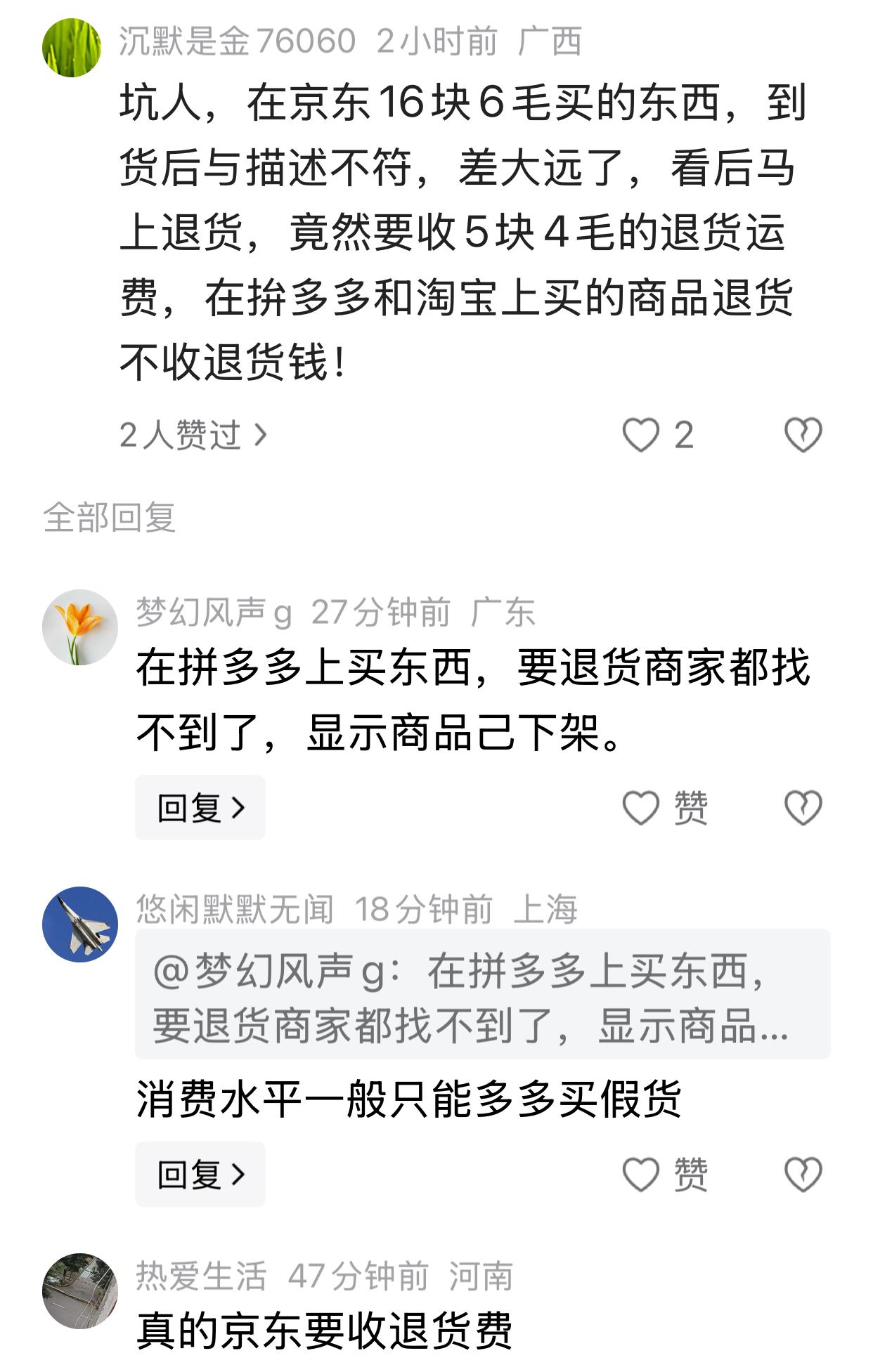 今天看到一个帖子说,坑人,在京东16块6毛买的东西,到货后与描述不符,差大远了,看后马上退货,竟然要收5块4毛的退货运费,在拚多多和淘宝上买的商品退货不收退货钱! 我曾经在京东上买了一个变压器,型号买错了,直接退货,三分钟退款到位了,没有收退货费。 现在买东西,我都是先去京东看看,如果有当天送到,立即下单。